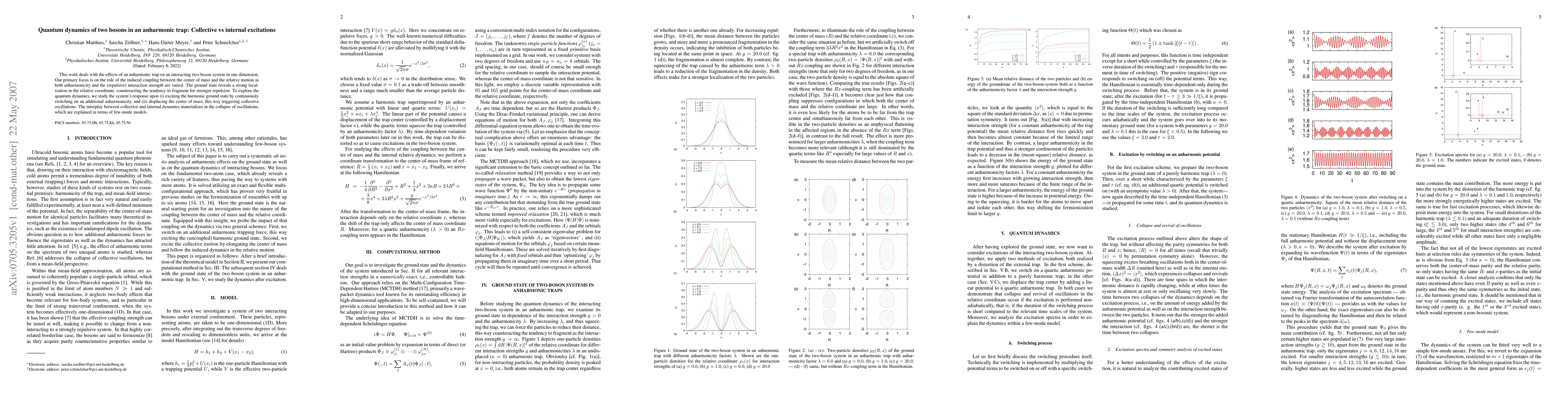 This paper investigates the quantum dynamics of two interacting bosons in a one-dimensional anharmonic trap, focusing on the coupling between center of mass and relative motion. The study reveals strong localization in the relative coordinate, countering fragmentation for stronger repulsion, and explores the system's response to anharmonicity and center of mass displacement, highlighting the interplay between collective and internal excitations.