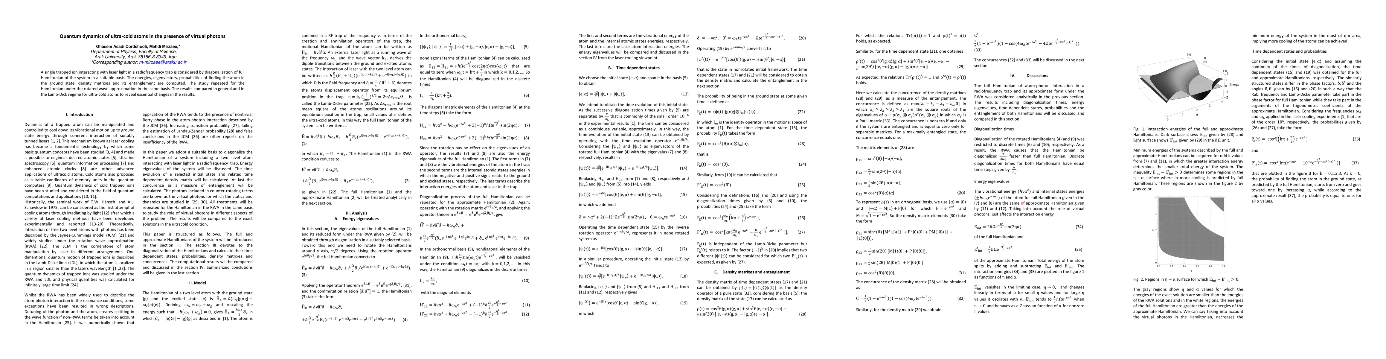 This paper investigates the quantum dynamics of a trapped ion interacting with laser light, analyzing its Hamiltonian and computing energy states, probabilities, and entanglement. Comparisons under standard and rotated wave approximations reveal significant changes in the dynamics of ultra-cold atoms in the Lamb-Dicke regime.