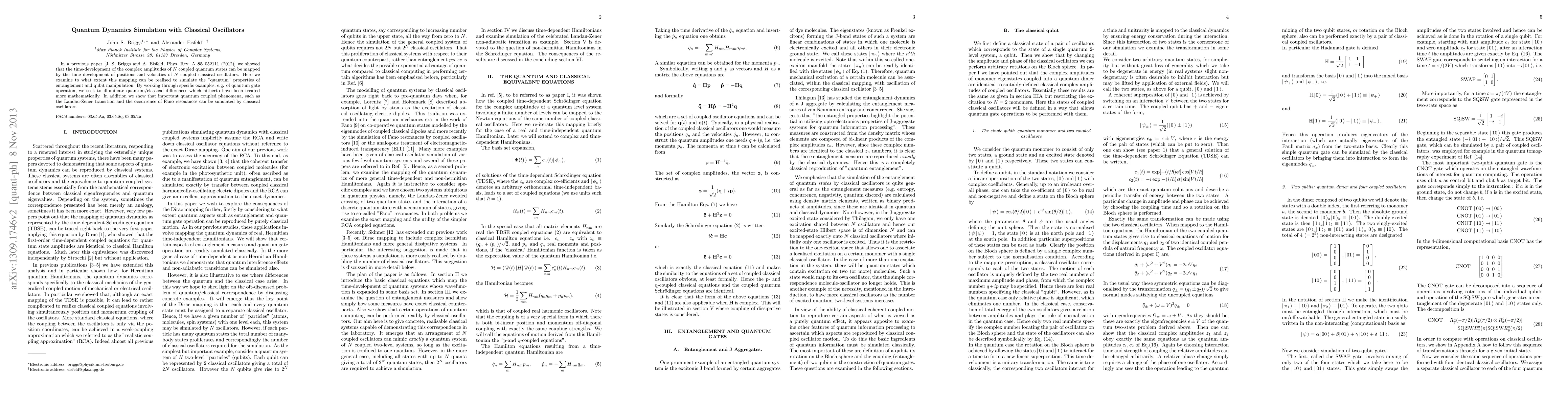 This paper extends previous work by demonstrating how classical oscillators can simulate quantum dynamics, particularly the properties of entanglement and qubit manipulation, while highlighting quantum/classical differences. It also shows that classical simulations can replicate significant quantum phenomena like the Landau-Zener transition and Fano resonances.