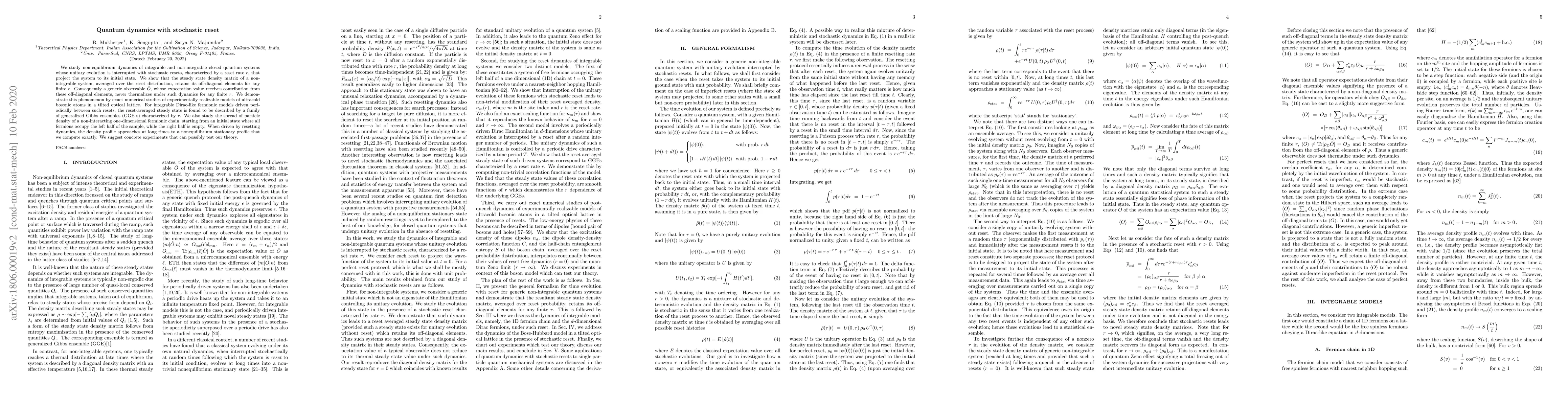 We study non-equilibrium dynamics of integrable and non-integrable closed quantum systems whose unitary evolution is interrupted with stochastic resets, characterized by a reset rate $r$, that project the system to its initial state. We show that the steady state density matrix of a non-integrable system, averaged over the reset distribution, retains its off-diagonal elements for any finite $r$. Consequently a generic observable $\hat O$, whose expectation value receives contribution from these off-diagonal elements, never thermalizes under such dynamics for any finite $r$. We demonstrate this phenomenon by exact numerical studies of experimentally realizable models of ultracold bosonic atoms in a tilted optical lattice. For integrable Dirac-like fermionic models driven periodically between such resets, the reset-averaged steady state is found to be described by a family of generalized Gibbs ensembles (GGE s) characterized by $r$. We also study the spread of particle density of a non-interacting one-dimensional fermionic chain, starting from an initial state where all fermions occupy the left half of the sample, while the right half is empty. When driven by resetting dynamics, the density profile approaches at long times to a nonequilibrium stationary profile that we compute exactly. We suggest concrete experiments that can possibly test our theory.