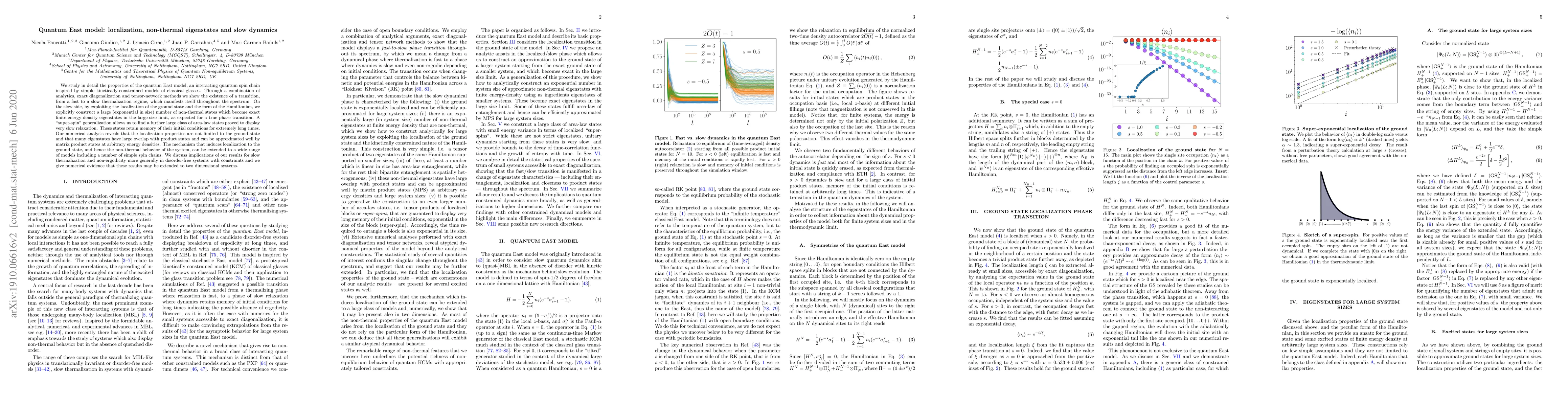We study in detail the properties of the quantum East model, an interacting quantum spin chain inspired by simple kinetically-constrained models of classical glasses. Through a combination of analytics, exact diagonalization and tensor-network methods we show the existence of a transition, from a fast to a slow thermalization regime, which manifests itself throughout the spectrum. On the slow side, by exploiting the localization of the ground state and the form of the Hamiltonian, we explicitly construct a large (exponential in size) number of non-thermal states which become exact finite-energy-density eigenstates in the large-size limit, as expected for a true phase transition. A ``super-spin'' generalization allows us to find a further large class of area-law states proved to display very slow relaxation. These states retain memory of their initial conditions for extremely long times. Our numerical analysis reveals that the localization properties are not limited to the ground state and that} many eigenstates have large overlap with product states and can be approximated well by matrix product states at arbitrary energy densities. The mechanism that induces localization to the ground state, and hence the non-thermal behavior of the system, can be extended to a wide range of models including a number of simple spin chains. We discuss implications of our results for slow thermalization and non-ergodicity more generally in disorder-free systems with constraints and we give numerical evidence that these results may be extended to two dimensional systems.