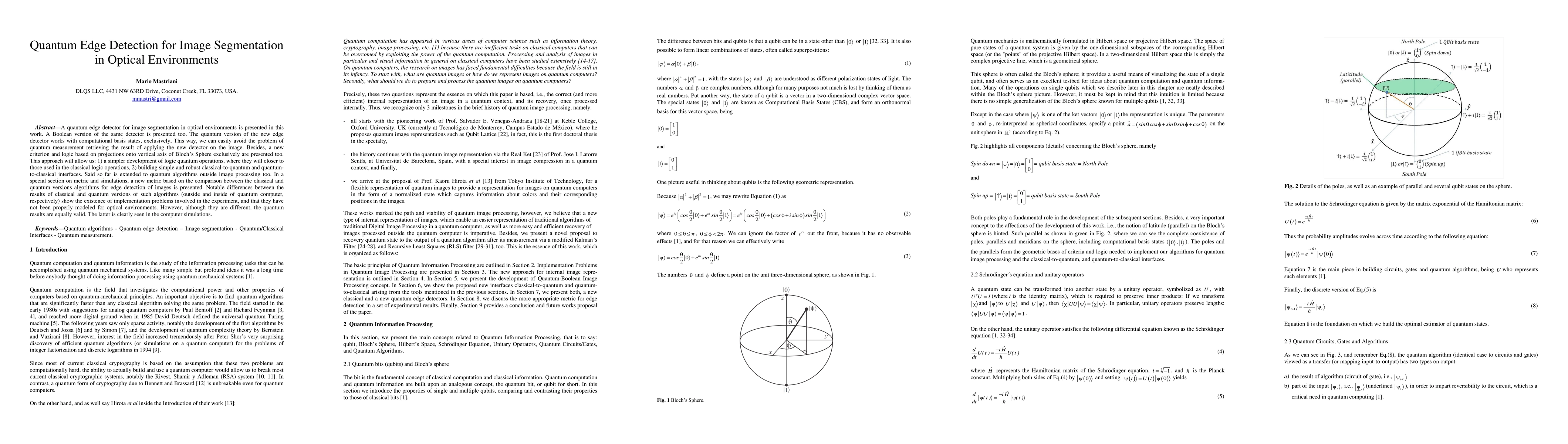 This paper introduces a quantum edge detector for image segmentation in optical environments, utilizing a Boolean version and computational basis states to avoid quantum measurement issues. It also presents a new criterion based on projections onto the vertical axis of Bloch's Sphere, facilitating simpler quantum logic operations and robust classical-to-quantum interfaces. Simulations reveal notable differences between classical and quantum edge detection algorithms, highlighting implementation issues yet validating the quantum results.