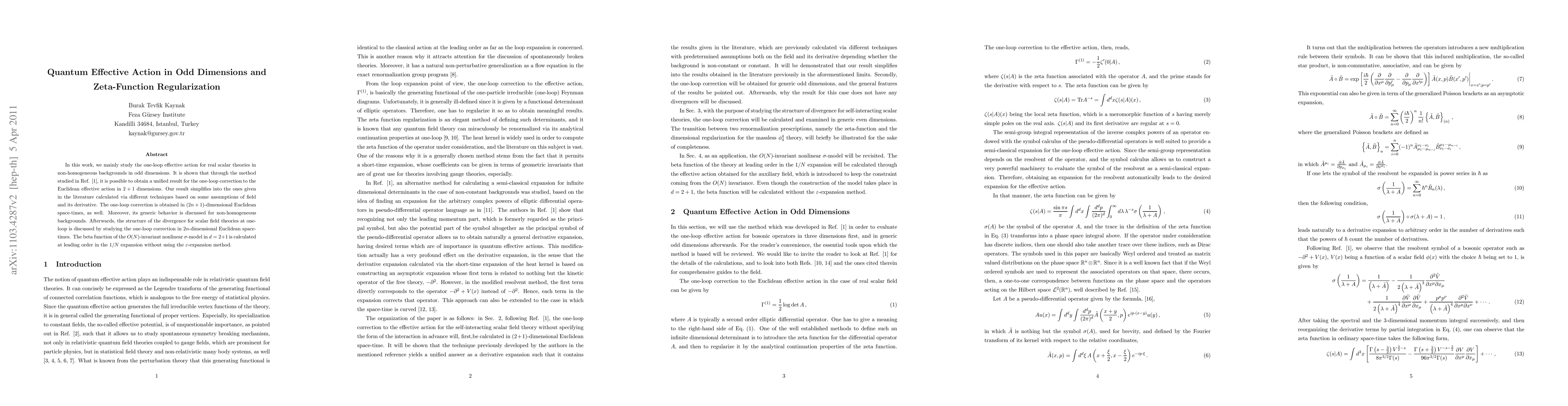 In this work, we mainly study the one-loop effective action for real scalar theories in non-homogeneous backgrounds in odd dimensions. It is shown that through the method studied in Ref. [1], it is possible to obtain a unified result for the one-loop correction to the Euclidean effective action in 2+1 dimensions. Our result simplifies into the ones given in the literature calculated via different techniques based on some assumptions of field and its derivative. The one-loop correction is obtained in (2n+1)-dimensional Euclidean space-times, as well. Moreover, its generic behavior is discussed for non-homogeneous backgrounds. Afterwards, the structure of the divergence for scalar field theories at one-loop is discussed by studying the one-loop correction in 2n-dimensional Euclidean space-times. The beta function of the O(N)-invariant nonlinear sigma-model in d=2+1 is calculated at leading order in the 1/N expansion without using the epsilon-expansion method.