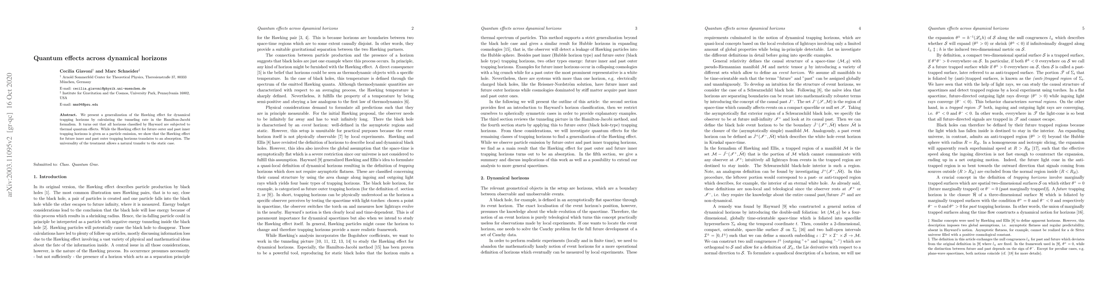 This paper generalizes the Hawking effect for dynamical horizons using the Hamilton-Jacobi formalism, revealing thermal quantum effects across all horizon types classified by Hayward. It shows particle emission for future outer and past inner horizons, while future inner and past outer horizons exhibit absorption.