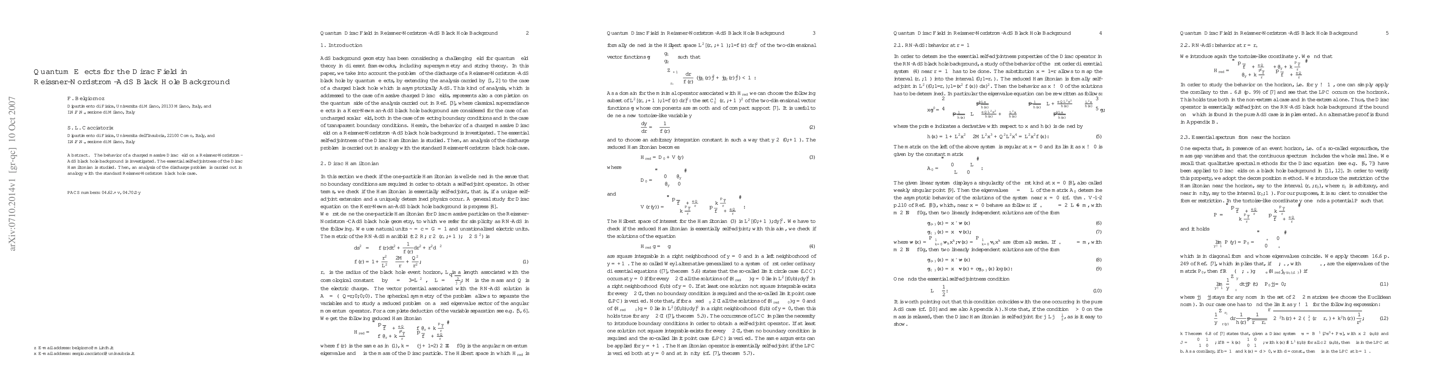 Summary: This research investigates the behavior of a charged massive Dirac field in a Reissner-Nordstrom-AdS black hole context, focusing on the self-adjointness of the Dirac Hamiltonian and analyzing the discharge problem akin to the Reissner-Nordstrom case.