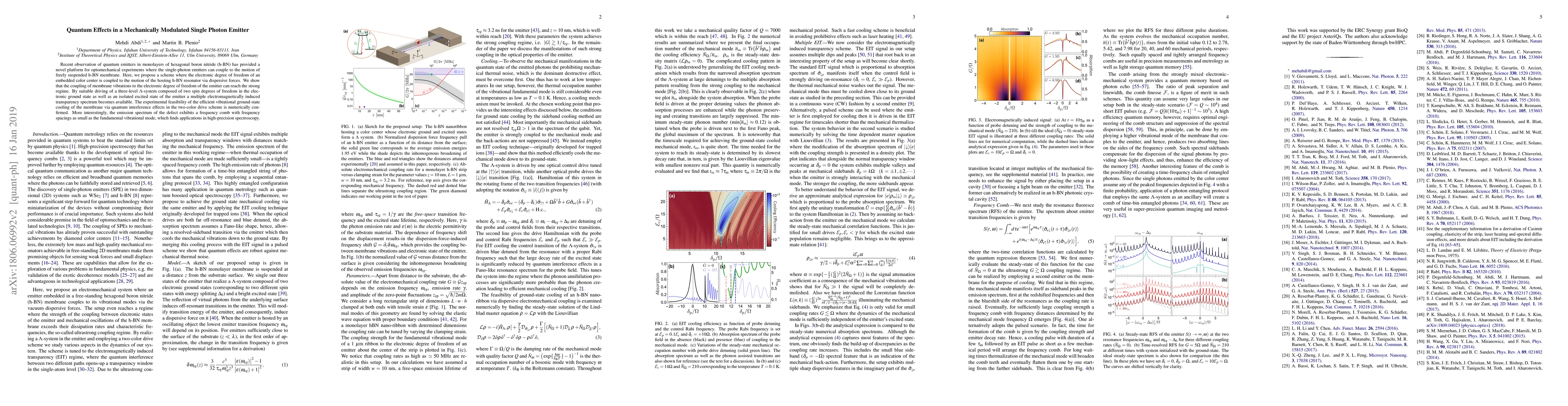 This paper proposes a scheme for strong coupling between a single-photon emitter in a hexagonal boron nitride membrane and the membrane's mechanical vibrations, enabling efficient ground-state cooling and high-precision spectroscopy through quantum interference effects. The study demonstrates the feasibility of achieving a multiple electromagnetically induced transparency spectrum and a frequency comb in the emission spectrum.