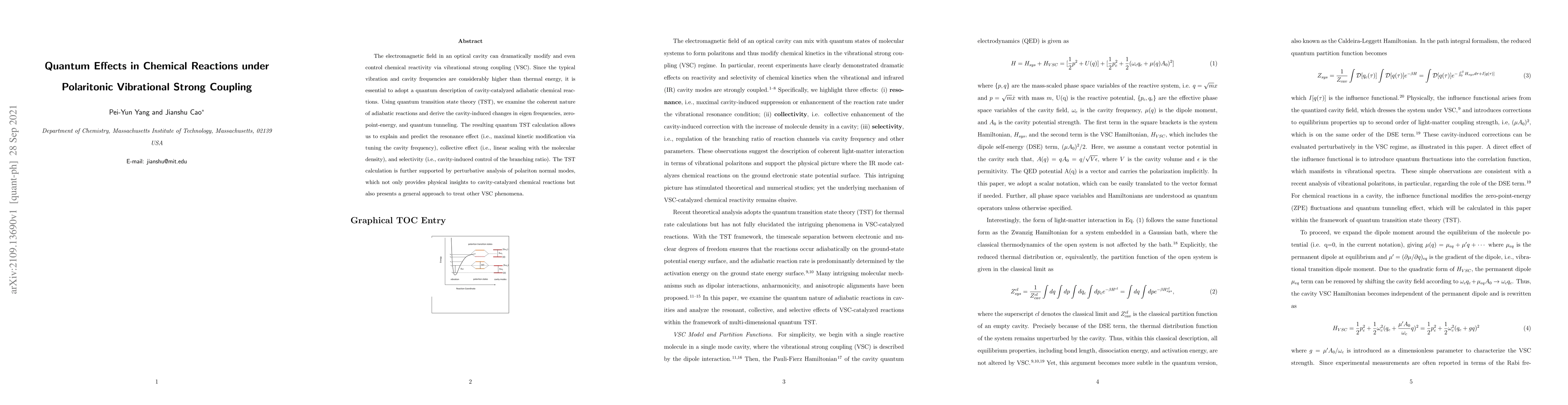 This paper explores how strong coupling between optical cavity fields and vibrational modes can control chemical reactions via quantum effects, using quantum transition state theory to predict resonance, collective, and selectivity effects in cavity-catalyzed reactions. Perturbative analysis of polariton modes offers deeper insights and a general method for treating vibrational strong coupling phenomena.