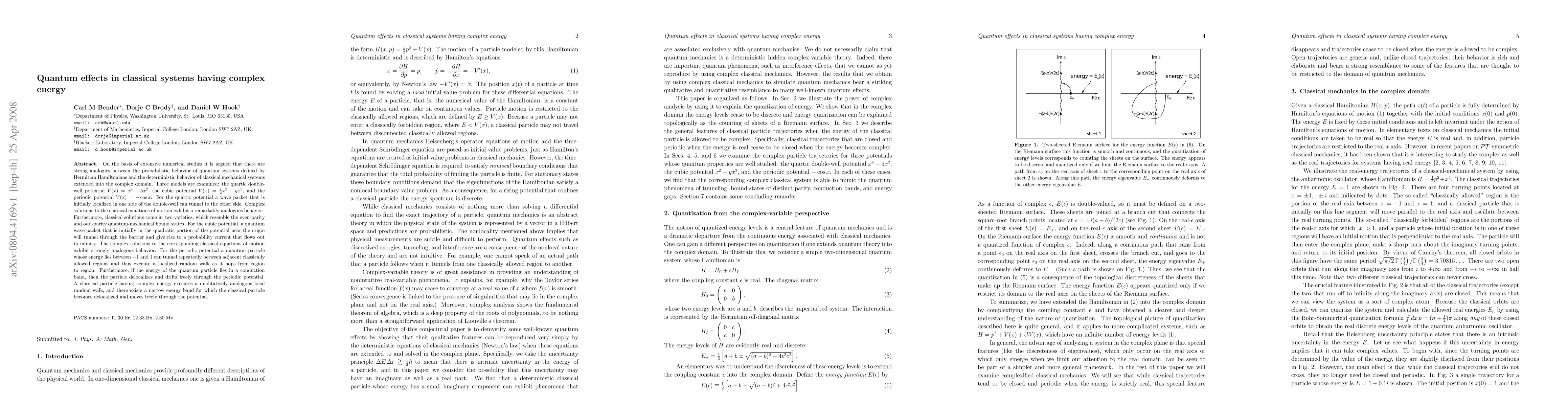 On the basis of extensive numerical studies it is argued that there are strong analogies between the probabilistic behavior of quantum systems defined by Hermitian Hamiltonians and the deterministic behavior of classical mechanical systems extended into the complex domain. Three models are examined: the quartic double-well potential $V(x)=x^4-5x^2$, the cubic potential $V(x)=frac{1}{2}x^2-gx^3$, and the periodic potential $V(x)=-\cos x$. For the quartic potential a wave packet that is initially localized in one side of the double-well can tunnel to the other side. Complex solutions to the classical equations of motion exhibit a remarkably analogous behavior. Furthermore, classical solutions come in two varieties, which resemble the even-parity and odd-parity quantum-mechanical bound states. For the cubic potential, a quantum wave packet that is initially in the quadratic portion of the potential near the origin will tunnel through the barrier and give rise to a probability current that flows out to infinity. The complex solutions to the corresponding classical equations of motion exhibit strongly analogous behavior. For the periodic potential a quantum particle whose energy lies between -1 and 1 can tunnel repeatedly between adjacent classically allowed regions and thus execute a localized random walk as it hops from region to region. Furthermore, if the energy of the quantum particle lies in a conduction band, then the particle delocalizes and drifts freely through the periodic potential. A classical particle having complex energy executes a qualitatively analogous local random walk, and there exists a narrow energy band for which the classical particle becomes delocalized and moves freely through the potential.