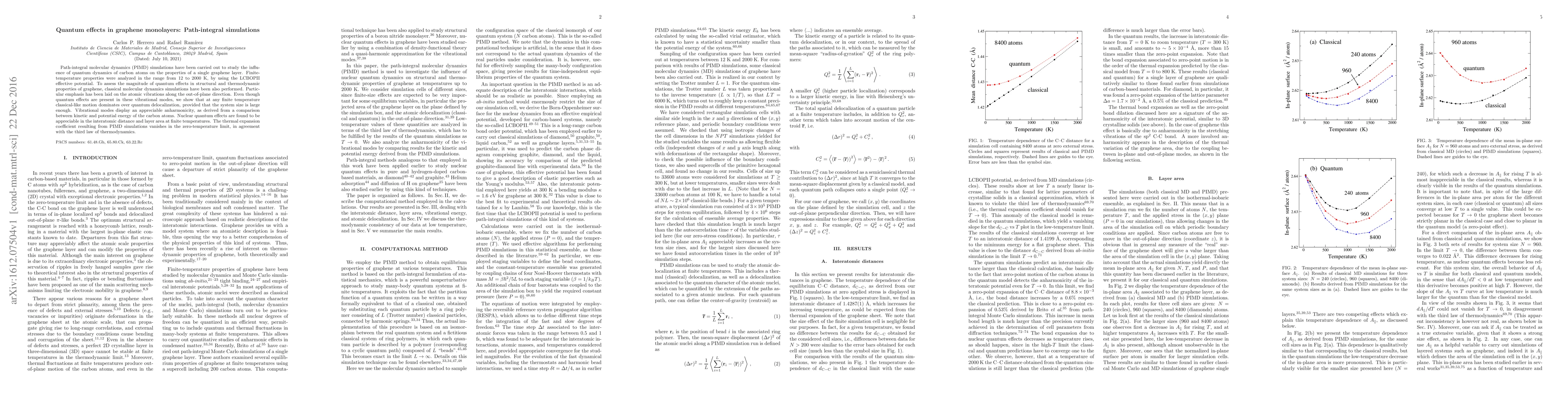 This study uses path-integral molecular dynamics simulations to investigate quantum effects in graphene monolayers at finite temperatures, finding that while quantum dynamics influence atomic vibrations and interatomic distances, classical-like motion dominates at large system sizes. The thermal expansion coefficient aligns with the third law of thermodynamics.