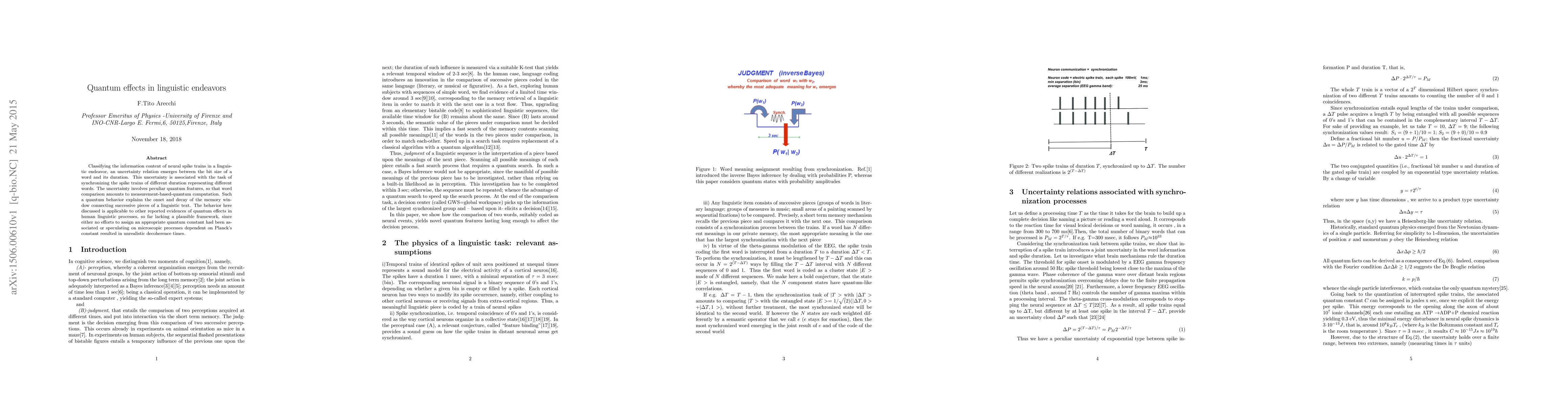 Classifying the information content of neural spike trains in a linguistic endeavor, an uncertainty relation emerges between the bit size of a word and its duration. This uncertainty is associated with the task of synchronizing the spike trains of different duration representing different words. The uncertainty involves peculiar quantum features, so that word comparison amounts to measurement-based-quantum computation. Such a quantum behavior explains the onset and decay of the memory window connecting successive pieces of a linguistic text. The behavior here discussed is applicable to other reported evidences of quantum effects in human linguistic processes, so far lacking a plausible framework, since either no efforts to assign an appropriate quantum constant had been associated or speculating on microscopic processes dependent on Planck's constant resulted in unrealistic decoherence times.