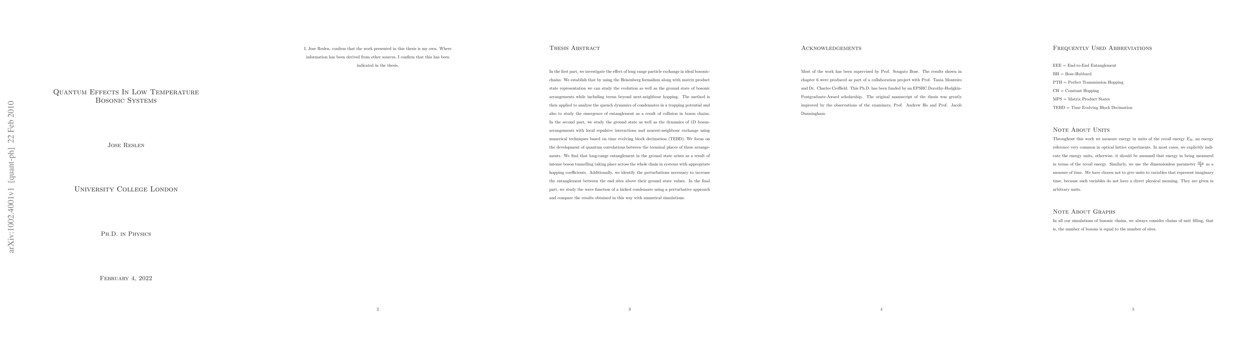 This paper explores quantum effects in low-temperature bosonic systems, employing Heisenberg formalism and matrix product states to analyze long-range particle exchange and entanglement in bosonic chains. It also uses TEBD to study dynamics and quantum correlations in systems with local interactions, revealing long-range entanglement due to boson tunneling.