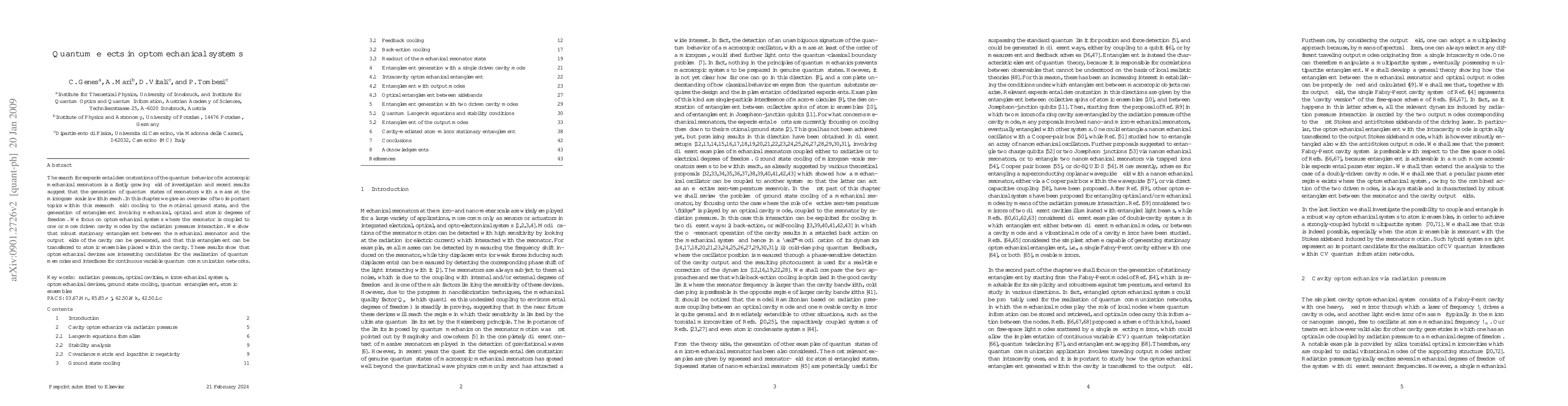 This paper reviews optomechanical systems where macroscopic mechanical resonators are coupled to cavity modes via radiation pressure, demonstrating ground state cooling and entanglement generation. It highlights the potential of these systems for quantum memories and quantum communication networks.