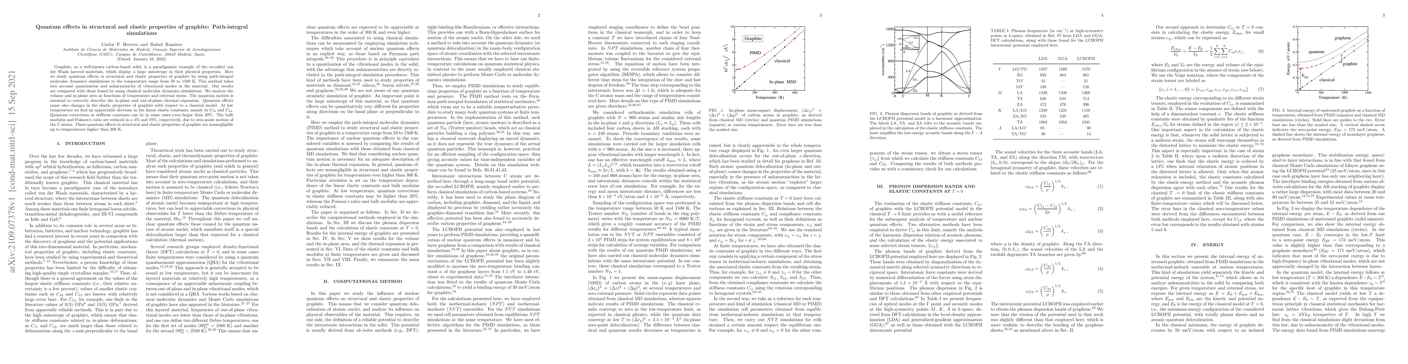 This study uses path-integral molecular dynamics simulations to investigate quantum effects on the structural and elastic properties of graphite across a wide temperature range. Quantum motion significantly alters thermal expansion and elastic constants, with reductions in stiffness constants and bulk modulus up to 20% and 4%, respectively, compared to classical models.