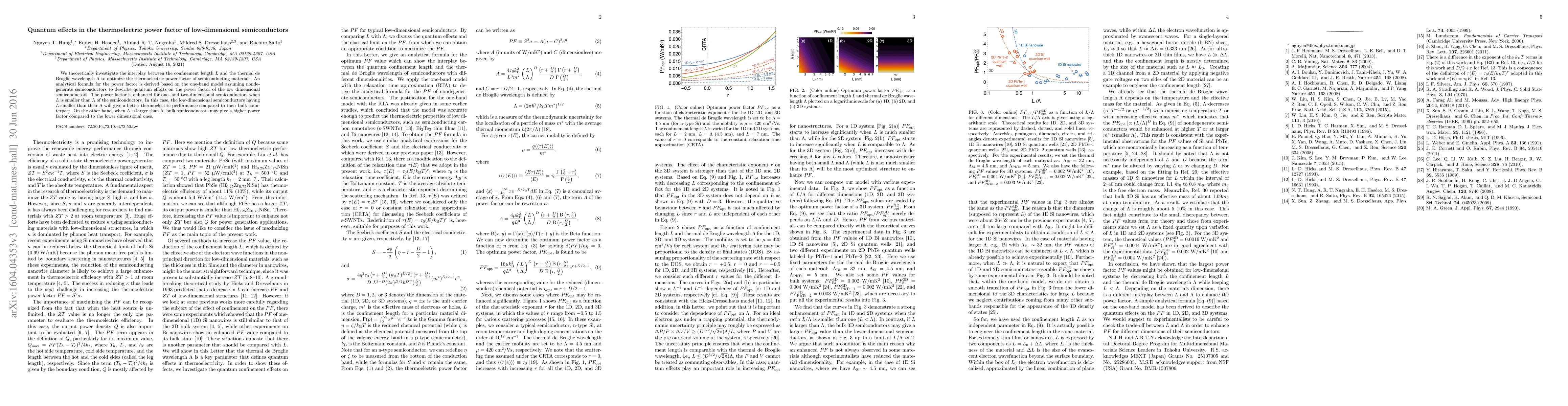 A new analytical formula has been derived to describe the power factor in 1D, 2D, and 3D systems, taking into account quantum effects.
