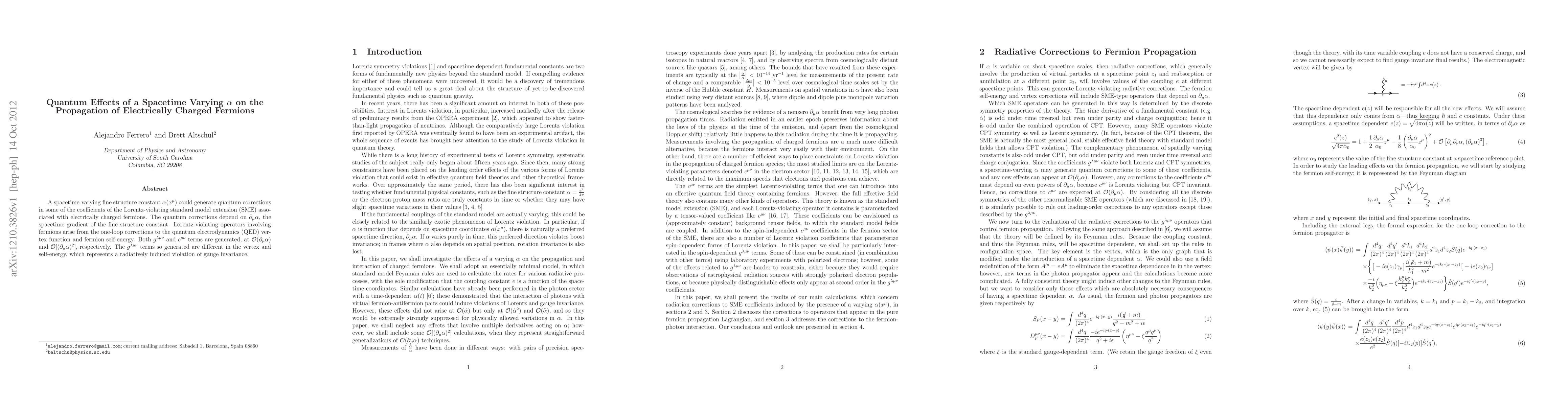 A spacetime-varying fine structure constant alpha(x^mu) could generate quantum corrections in some of the coefficients of the Lorentz-violating standard model extension (SME) associated with electrically charged fermions. The quantum corrections depend on d_mu alpha, the spacetime gradient of the fine structure constant. Lorentz-violating operators involving fermions arise from the one-loop corrections to the quantum electrodynamics (QED) vertex function and fermion self-energy. Both g^(lambda mu nu) and c^(mu nu) terms are generated, at O(d_mu alpha) and O[(d_mu alpha)^2], respectively. The g^(lambda mu nu) terms so generated are different in the vertex and self-energy, which represents a radiatively induced violation of gauge invariance.