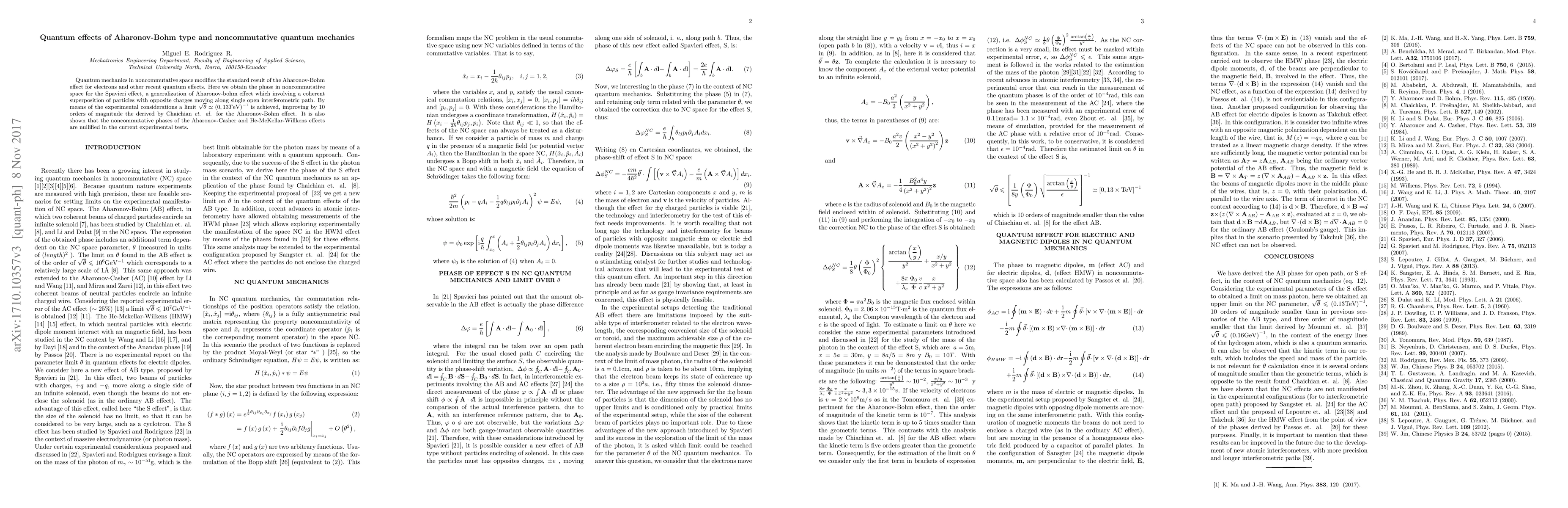 This paper explores quantum mechanics in noncommutative space, demonstrating modifications to the Aharonov-Bohm effect and deriving a phase for the Spavieri effect. Experimental results improve the limit for the Aharonov-Bohm effect by 10 orders of magnitude, while showing noncommutative phases of other quantum effects to be nullified.