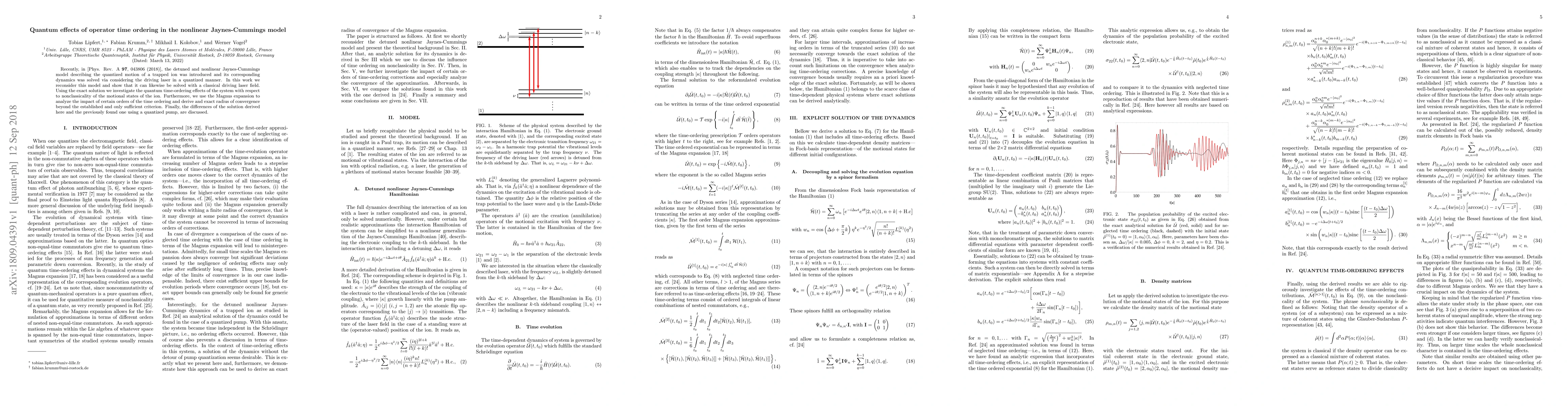 Recently, in [Phys. Rev. A 97, 043806 (2018)], the detuned and nonlinear Jaynes-Cummings model describing the quantized motion of a trapped ion was introduced and its corresponding dynamics was solved via considering the driving laser in a quantized manner. In this work we reconsider this model and show that it can likewise be solved with a classical driving laser field. Using the exact solution we investigate the quantum time-ordering effects of the system with respect to nonclassicality of the motional states of the ion. Furthermore, we use the Magnus expansion to analyze the impact of certain orders of the time ordering and derive and exact radius of convergence beyond the established and only sufficient criterion. Finally, the differences of the solution derived here and the previously found one using a quantized pump, are discussed.