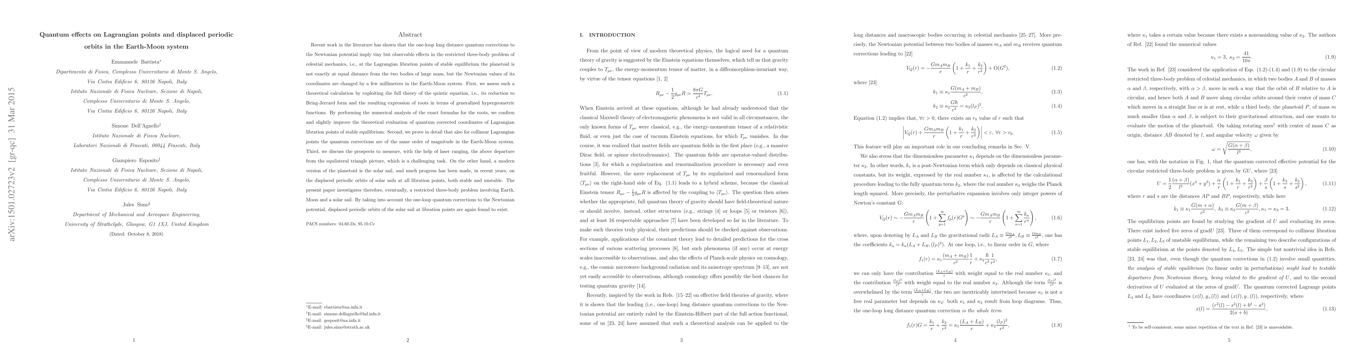 Researchers confirm tiny but observable quantum effects on Lagrangian points in the Earth-Moon system, which can be measured using laser ranging, and also find displaced periodic orbits for a solar sail.