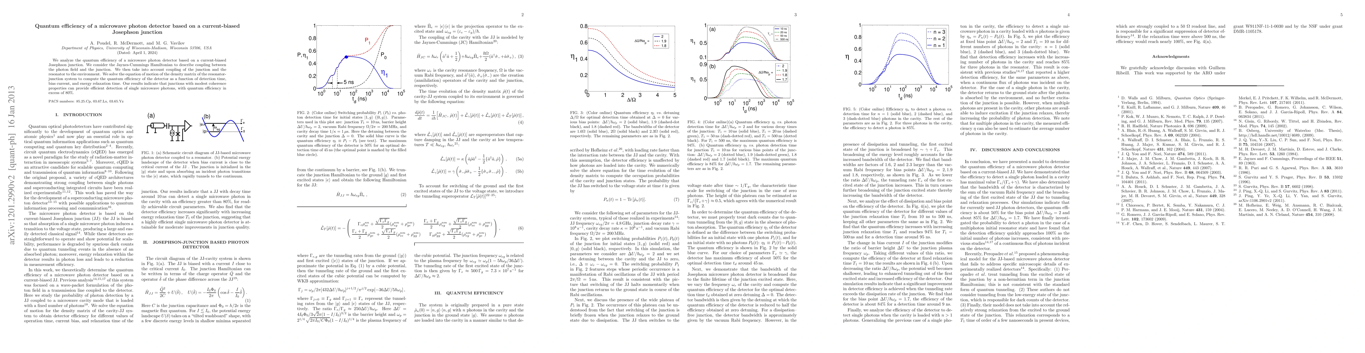 We analyze the quantum efficiency of a microwave photon detector based on a current-biased Josephson junction. We consider the Jaynes-Cummings Hamiltonian to describe coupling between the photon field and the junction. We then take into account coupling of the junction and the resonator to the environment. We solve the equation of motion of the density matrix of the resonator-junction system to compute the quantum efficiency of the detector as a function of detection time, bias current, and energy relaxation time. Our results indicate that junctions with modest coherence properties can provide efficient detection of single microwave photons, with quantum efficiency in excess of 80%.