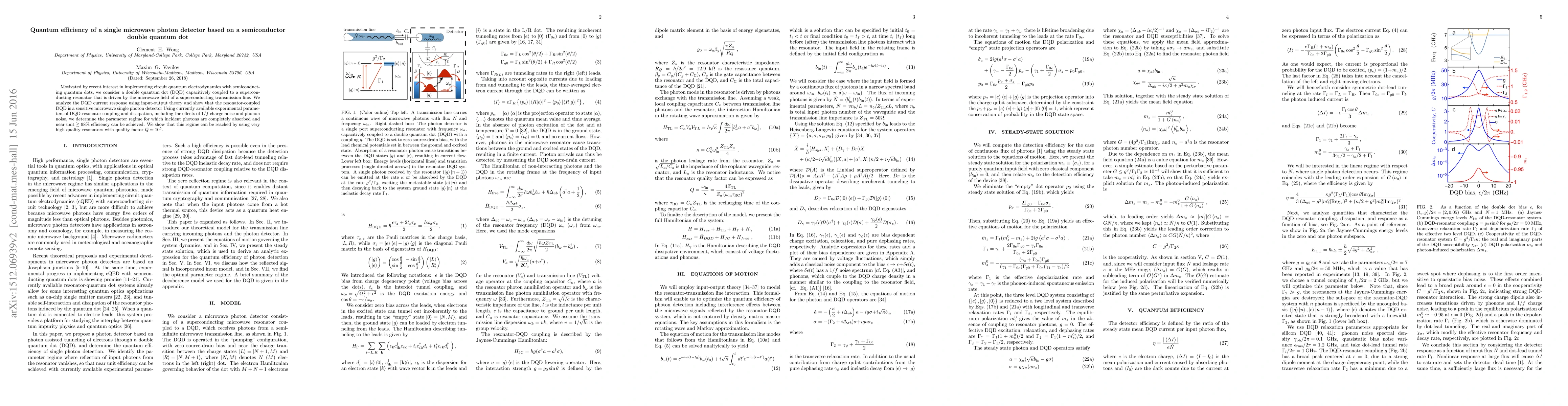 This paper investigates the quantum efficiency of a microwave photon detector based on a double quantum dot (DQD) coupled to a superconducting resonator. The study demonstrates that under optimal conditions, including high-quality resonators with $Q\simeq 10^5$, the DQD-resonator system can achieve near-unit quantum efficiency of $\gtrsim$ 98% for detecting single microwave photons.