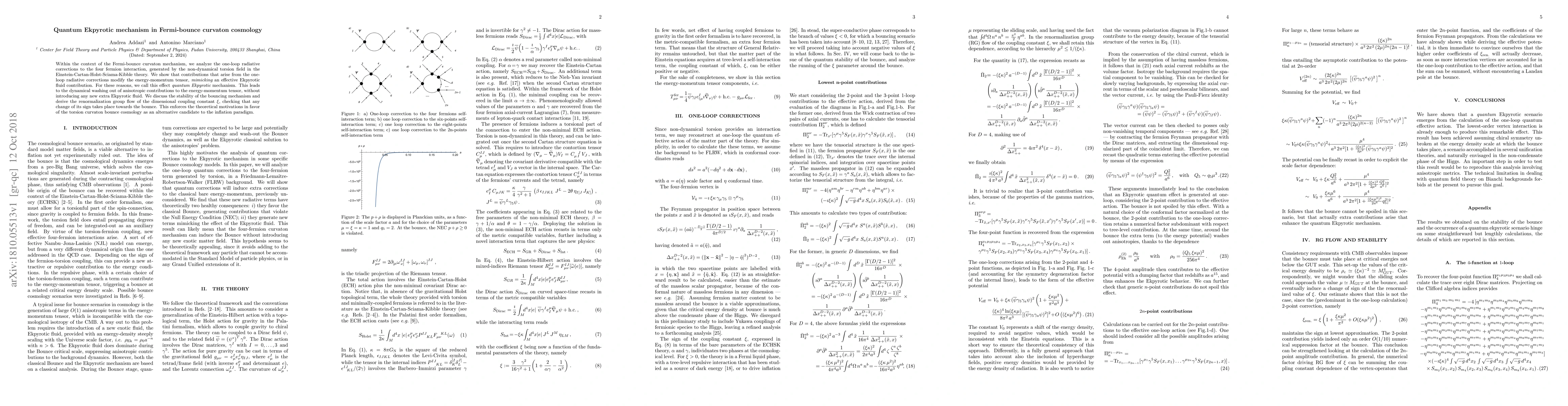 Within the context of the Fermi-bounce curvaton mechanism, we analyze the one-loop radiative corrections to the four fermion interaction, generated by the non-dynamical torsion field in the Einstein-Cartan-Holst-Sciama-Kibble theory. We show that contributions that arise from the one-loop radiative corrections modify the energy-momentum tensor, {\it mimicking} an effective Ekpyrotic fluid contribution. For these reasons, we call this effect {\it quantum Ekpyrotic} mechanism. This leads to the dynamical washing out of anisotropic contributions to the energy-momentum tensor, without introducing any new extra Ekpyrotic fluid. We discuss the stability of the bouncing mechanism and derive the renormalization group flow of the dimensional coupling constant $\xi$, checking that any change of its sign takes place towards the bounce. This enforces the theoretical motivations in favor of the torsion curvaton bounce cosmology as an alternative candidate to the inflation paradigm.