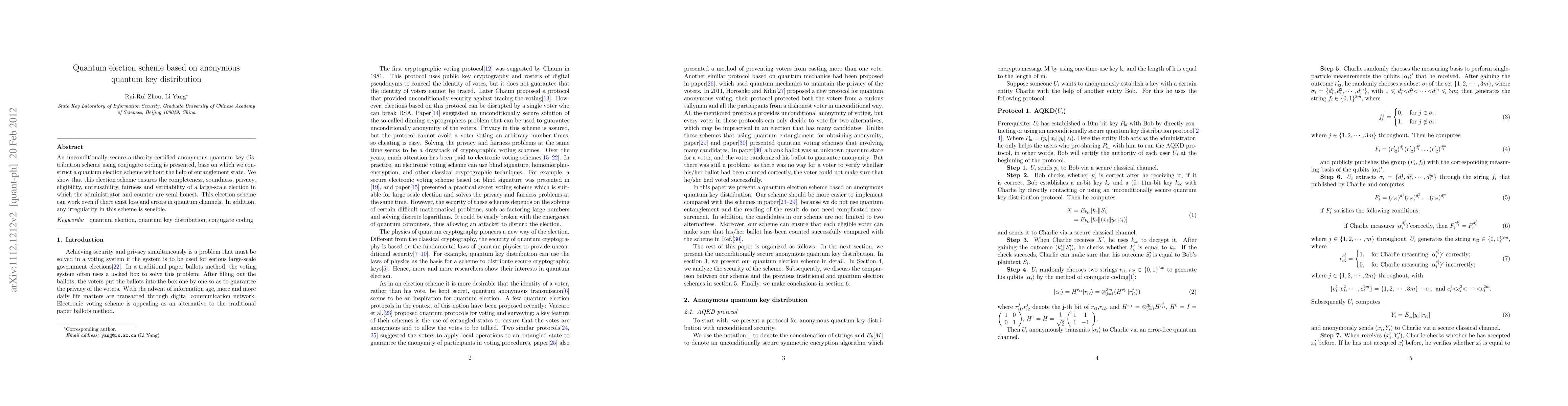 This paper proposes an unconditionally secure quantum election scheme based on anonymous quantum key distribution using conjugate coding, ensuring completeness, soundness, privacy, and fairness without requiring entanglement states, even in the presence of quantum channel loss and errors. Any irregularities in the scheme are detectable.