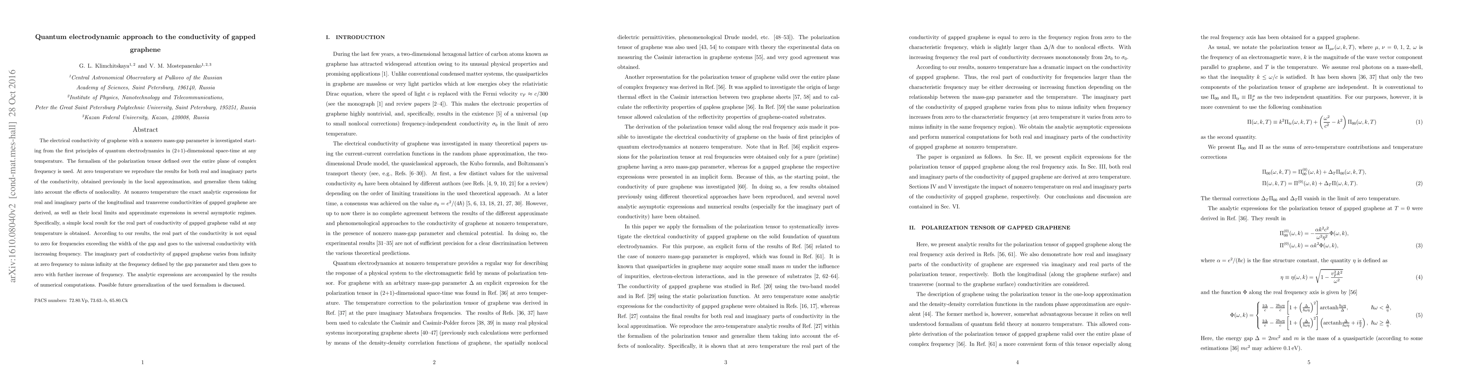The electrical conductivity of graphene with a nonzero mass-gap parameter is investigated starting from the first principles of quantum electrodynamics in (2+1)-dimensional space-time at any temperature. The formalism of the polarization tensor defined over the entire plane of complex frequency is used. At zero temperature we reproduce the results for both real and imaginary parts of the conductivity, obtained previously in the local approximation, and generalize them taking into account the effects of nonlocality. At nonzero temperature the exact analytic expressions for real and imaginary parts of the longitudinal and transverse conductivities of gapped graphene are derived, as well as their local limits and approximate expressions in several asymptotic regimes. Specifically, a simple local result for the real part of conductivity of gapped graphene valid at any temperature is obtained. According to our results, the real part of the conductivity is not equal to zero for frequencies exceeding the width of the gap and goes to the universal conductivity with increasing frequency. The imaginary part of conductivity of gapped graphene varies from infinity at zero frequency to minus infinity at the frequency defined by the gap parameter and then goes to zero with further increase of frequency. The analytic expressions are accompanied by the results of numerical computations. Possible future generalization of the used formalism is discussed.