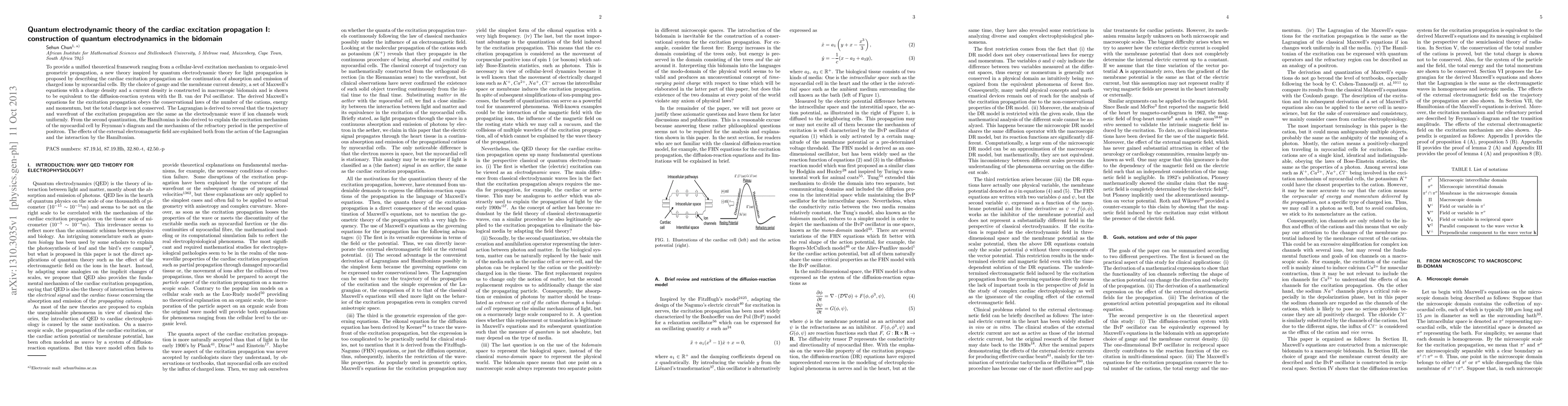 To provide a unified theoretical framework ranging from a cellular-level excitation mechanism to organic-level geometric propagation, a new theory inspired by quantum electrodynamic theory for light propagation is proposed by describing the cardiac excitation propagation as the continuation of absorption and emission of charged ions by myocardial cells. By the choice of gauge and the membrane current density, a set of Maxwell's equations with a charge density and a current density is constructed in macroscopic bidomain and is shown to be equivalent to the diffusion-reaction system with the B. van der Pol oscillator. The derived Maxwell's equations for the excitation propagation obeys the conservational laws of the number of the cations, energy and momentum, but the total charge is not conserved. The Lagrangian is derived to reveal that the trajectory and wavefront of the excitation propagation are the same as the electrodynamic wave if ion channels work uniformly. From the second quantization, the Hamiltonian is also derived to explain the excitation mechanism of the myocardial cell by Feynman's diagram and the mechanism of the refractory period in the perspective of positron. The effects of the external electromagnetic field are explained both from the action of the Lagrangian and the interaction by the Hamiltonian.