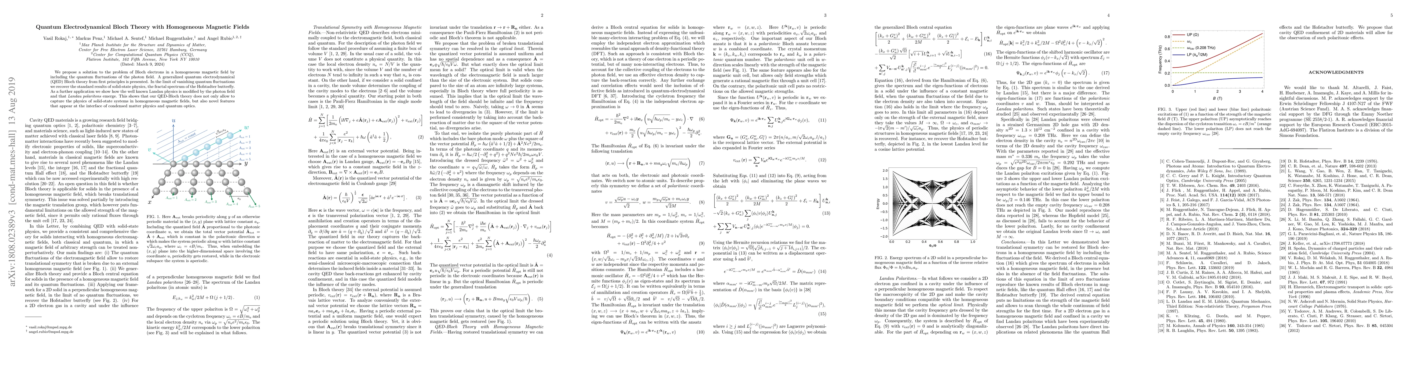 We propose a solution to the problem of Bloch electrons in a homogeneous magnetic field by including the quantum fluctuations of the photon field. A generalized quantum electrodynamical (QED) Bloch theory from first principles is presented. In the limit of vanishing quantum fluctuations we recover the standard results of solid-state physics, for instance, the fractal spectrum of the Hofstadter butterfly. As a further application we show how the well known Landau physics is modified by the photon field and that Landau polaritons emerge. This shows that our QED-Bloch theory does not only allow to capture the physics of solid-state systems in homogeneous magnetic fields, but also novel features that appear at the interface of condensed matter physics and quantum optics.