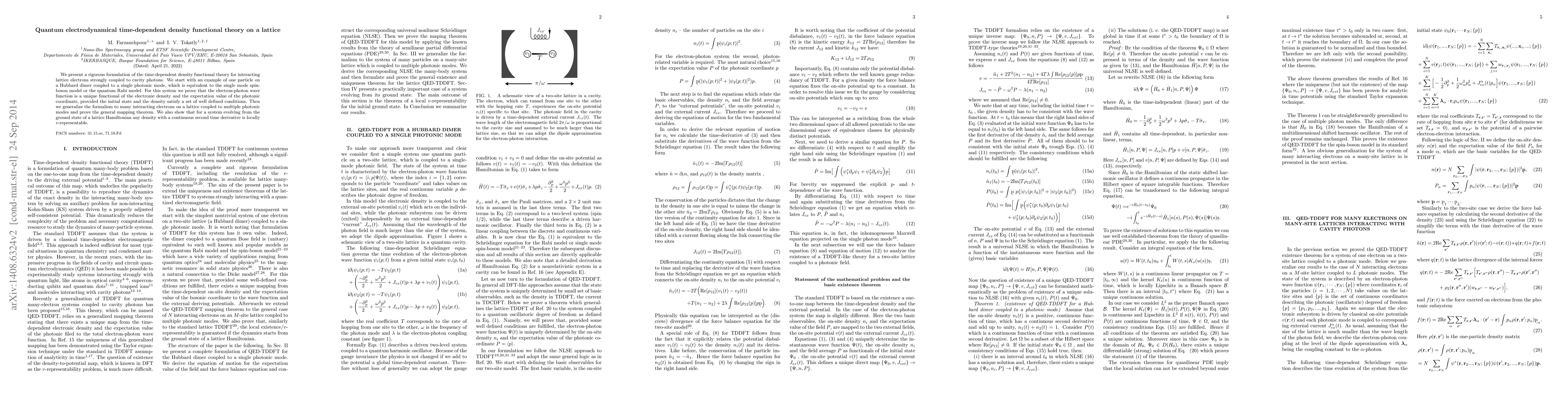 This paper rigorously formulates time-dependent density functional theory for lattice electrons interacting with cavity photons, proving the electron-photon wave function's uniqueness under specific conditions. It extends the formalism to many-electron systems and demonstrates local $v$-representability for systems evolving from ground states.