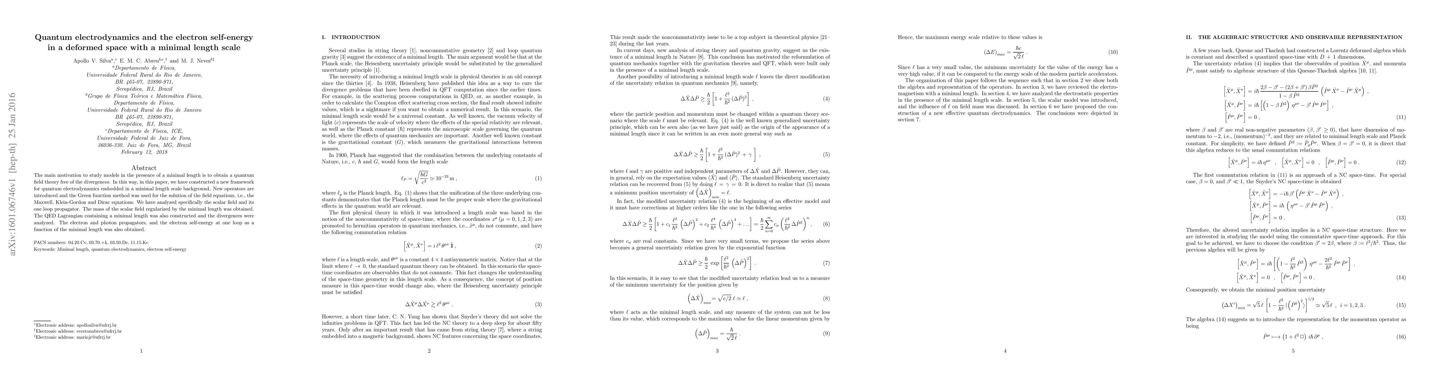 This paper presents a novel quantum electrodynamics (QED) model incorporating a minimal length scale to eliminate divergences. It introduces new operators and uses the Green function method to solve Maxwell, Klein-Gordon, and Dirac equations. The scalar field's mass regularized by minimal length and QED Lagrangian with minimal length are derived, along with electron and photon propagators, and the electron self-energy at one loop as a function of minimal length.