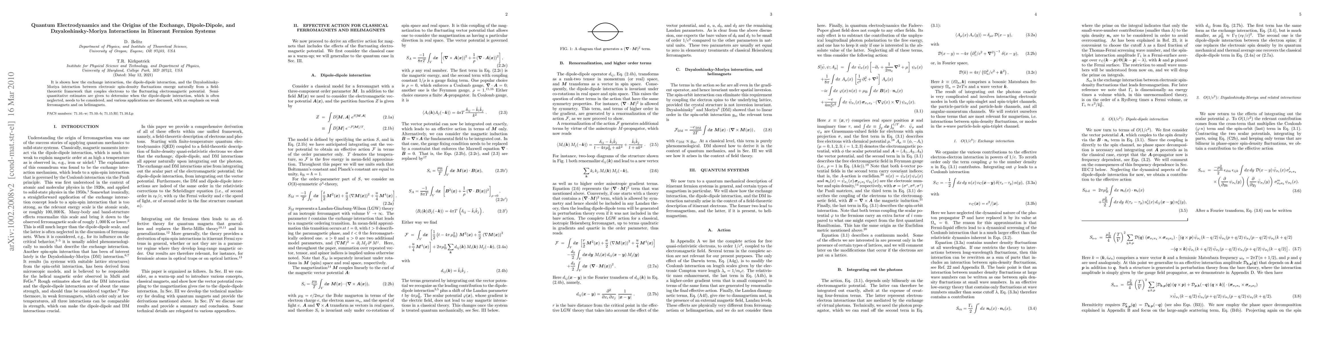This paper demonstrates how quantum electrodynamics provides a framework for understanding the exchange, dipole-dipole, and Dzyaloshinsky-Moriya interactions in itinerant fermion systems by coupling electrons to electromagnetic fields. It also provides semi-quantitative estimates for when dipole-dipole interactions become significant, with applications to weak ferromagnets and helimagnets.