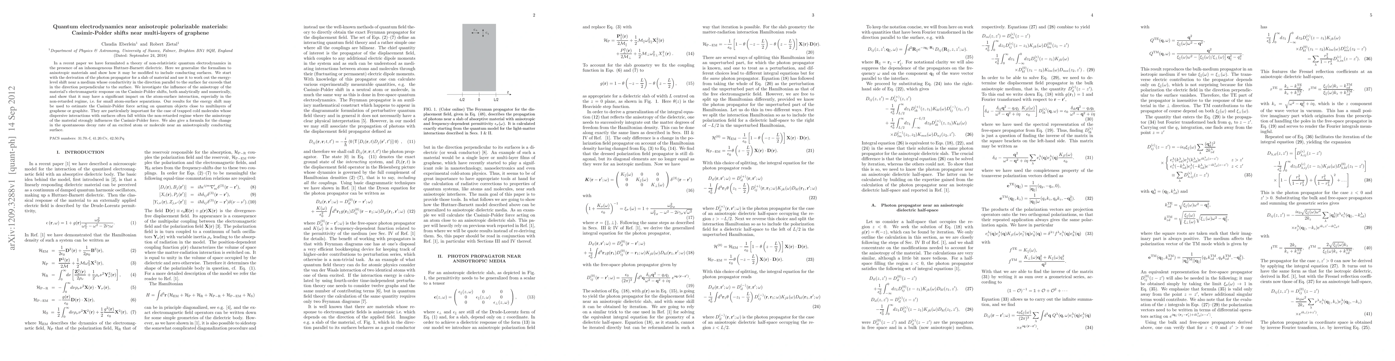 This paper generalizes a quantum electrodynamics framework to anisotropic materials, focusing on the photon propagator for anisotropic polarizable materials like graphene. It investigates the impact of material anisotropy on Casimir-Polder shifts, showing significant effects on atom-surface interactions in the non-retarded regime, and provides formulas for the Casimir-Polder force and spontaneous decay rate near anisotropic surfaces.