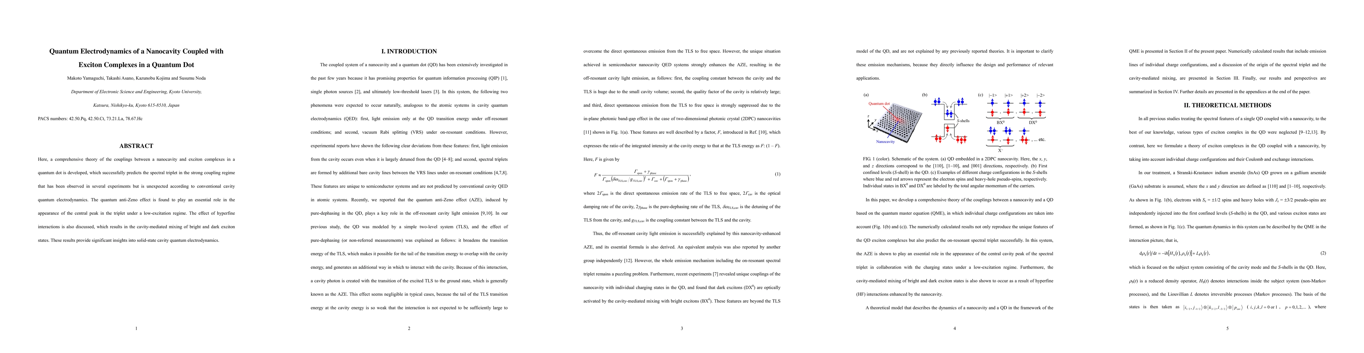 Here, a comprehensive theory of the couplings between a nanocavity and exciton complexes in a quantum dot is developed, which successfully predicts the spectral triplet in the strong coupling regime that has been observed in several experiments but is unexpected according to conventional cavity quantum electrodynamics. The quantum anti-Zeno effect is found to play an essential role in the appearance of the central peak in the triplet under a low-excitation regime. The effect of hyperfine interactions is also discussed, which results in the cavity-mediated mixing of bright and dark exciton states. These results provide significant insights into solid-state cavity quantum electrodynamics.
