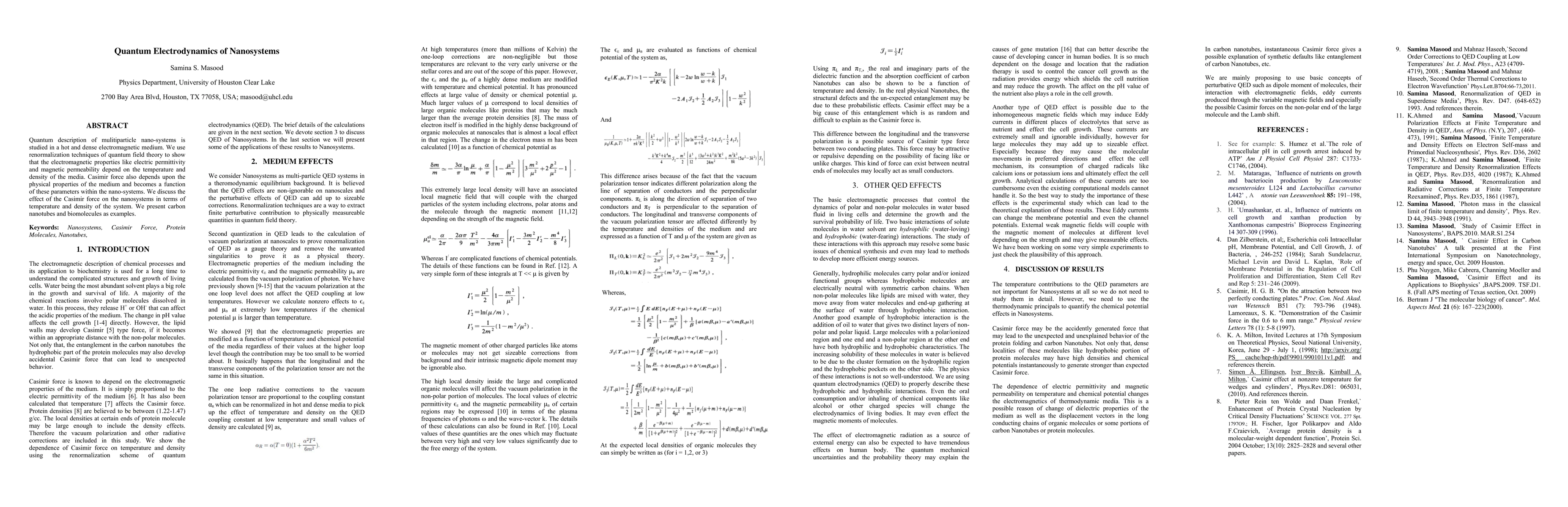 Quantum description of mulitiparticle nano-systems is studied in a hot and dense electromagnetic medium. We use renormalization techniques of quantum field theory to show that the electromagnetic properties like electric permittivity and magnetic permeability depend on the temperature and density of the media. Casimir force also depends upon the physical properties of the medium and becomes a function of these parameters within the nano-systems. We discuss the effect of the Casimir force on the nanosystems in terms of temperature and density of the system. We present carbon nanotubes and biomolecules as examples.