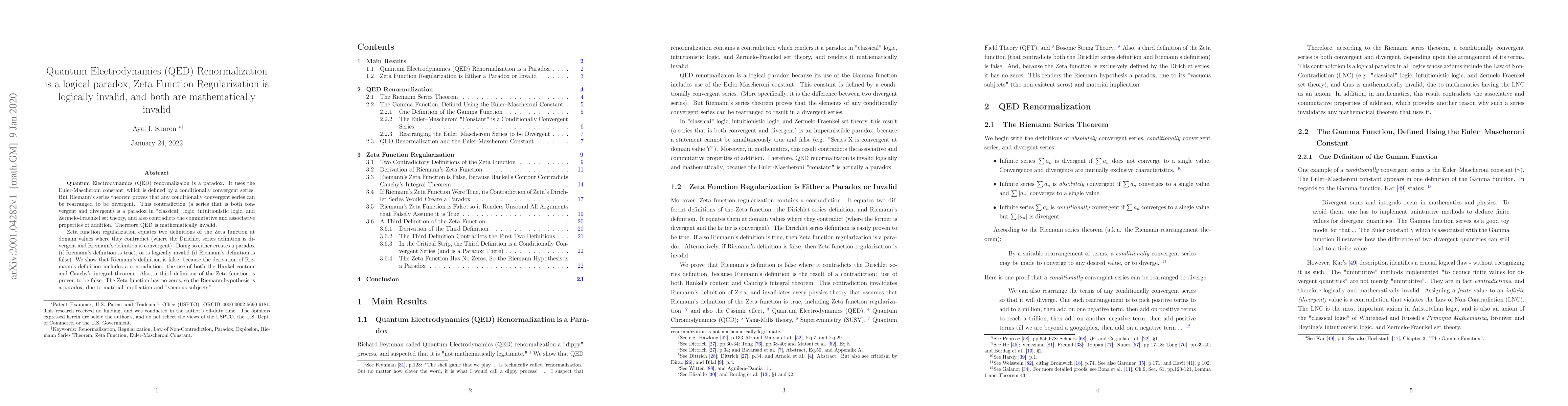 Quantum Electrodynamics (QED) renormalizaion is a paradox. It uses the Euler-Mascheroni constant, which is defined by a conditionally convergent series. But Riemann's series theorem proves that any conditionally convergent series can be rearranged to be divergent. This contradiction (a series that is both convergent and divergent) is a paradox in "classical" logic, intuitionistic logic, and Zermelo-Fraenkel set theory, and also contradicts the commutative and associative properties of addition. Therefore QED is mathematically invalid. Zeta function regularization equates two definitions of the Zeta function at domain values where they contradict (where the Dirichlet series definition is divergent and Riemann's definition is convergent). Doing so either creates a paradox (if Riemann's definition is true), or is logically invalid (if Riemann's definition is false). We show that Riemann's definition is false, because the derivation of Riemann's definition includes a contradiction: the use of both the Hankel contour and Cauchy's integral theorem. Also, a third definition of the Zeta function is proven to be false. The Zeta function has no zeros, so the Riemann hypothesis is a paradox, due to material implication and "vacuous subjects".