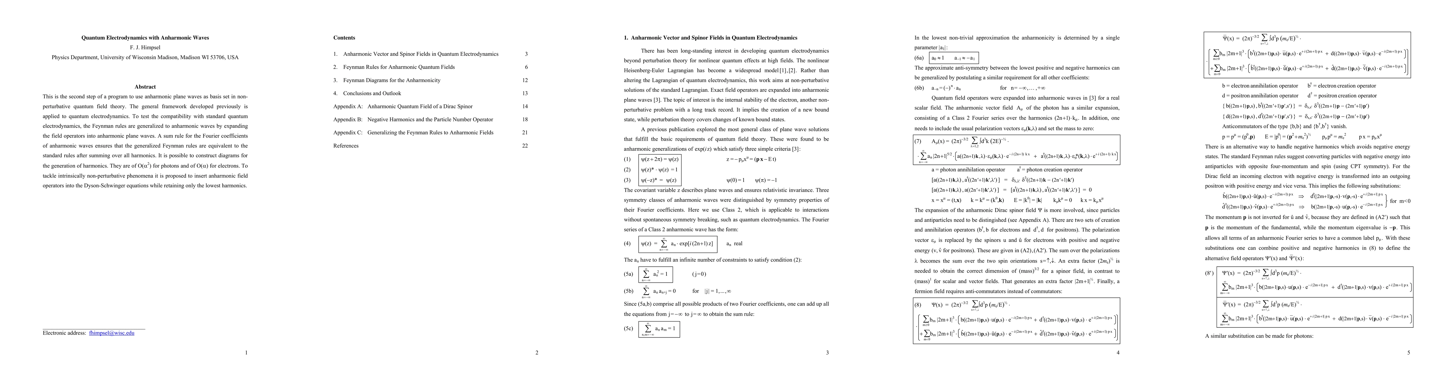 This is the second step of a program to use anharmonic plane waves as basis set in non-perturbative quantum field theory. The general framework developed previously is applied to quantum electrodynamics. To test the compatibility with standard quantum electrodynamics, the Feynman rules are generalized to anharmonic waves by expanding the field operators into anharmonic plane waves. A sum rule for the Fourier coefficients of anharmonic waves ensures that the generalized Feynman rules are equivalent to the standard rules after summing over all harmonics. It is possible to construct diagrams for the generation of harmonics. They are of O(alpha^2) for photons and of O(alpha) for electrons. To tackle intrinsically non-perturbative phenomena it is proposed to insert anharmonic field operators into the Dyson-Schwinger equations while retaining only the lowest harmonics.
