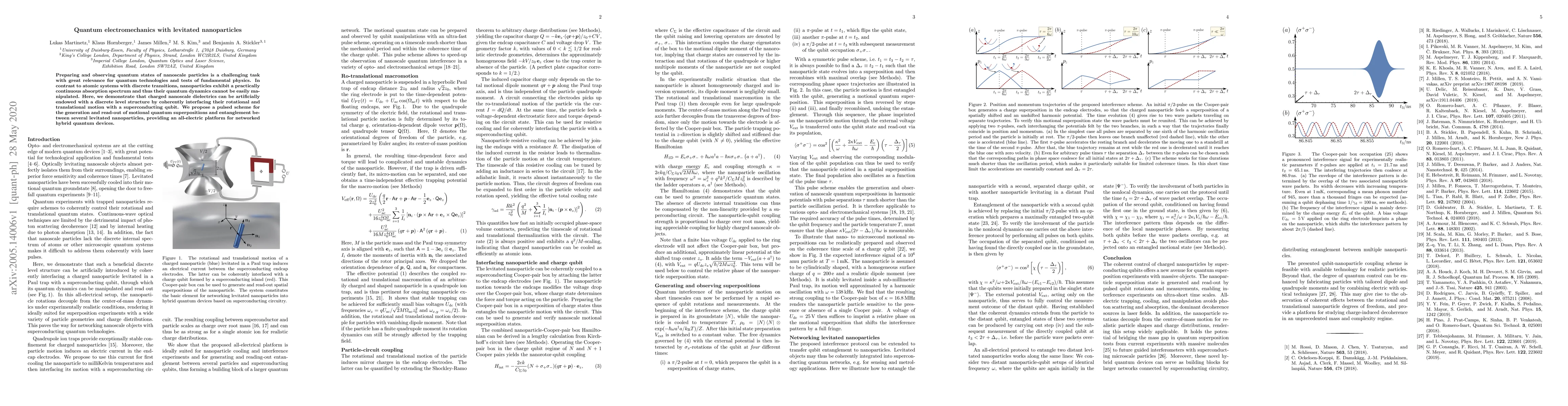 Preparing and observing quantum states of nanoscale particles is a challenging task with great relevance for quantum technologies and tests of fundamental physics. In contrast to atomic systems with discrete transitions, nanoparticles exhibit a practically continuous absorption spectrum and thus their quantum dynamics cannot be easily manipulated. Here, we demonstrate that charged nanoscale dielectrics can be artificially endowed with a discrete level structure by coherently interfacing their rotational and translational motion with a superconducting qubit. We propose a pulsed scheme for the generation and read-out of motional quantum superpositions and entanglement between several levitated nanoparticles, providing an all-electric platform for networked hybrid quantum devices.