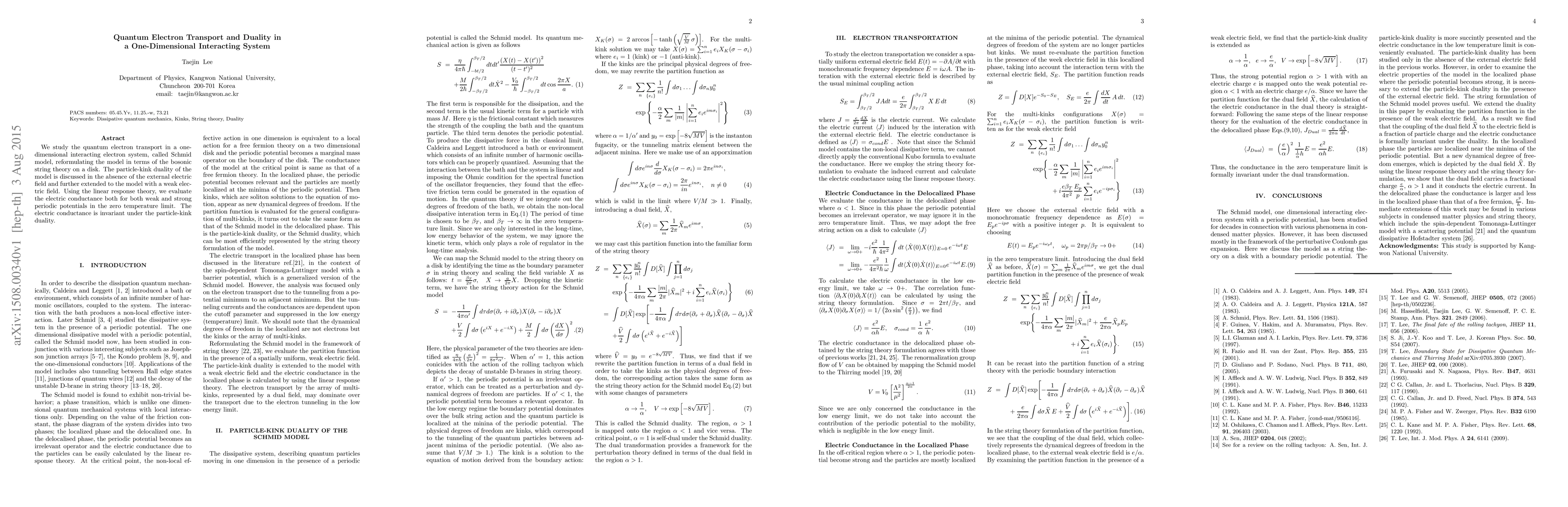 This paper explores quantum electron transport in a one-dimensional interacting Schmid model, reformulated via bosonic string theory. It investigates particle-kink duality and electric conductance under weak and strong periodic potentials, revealing invariance under duality.
