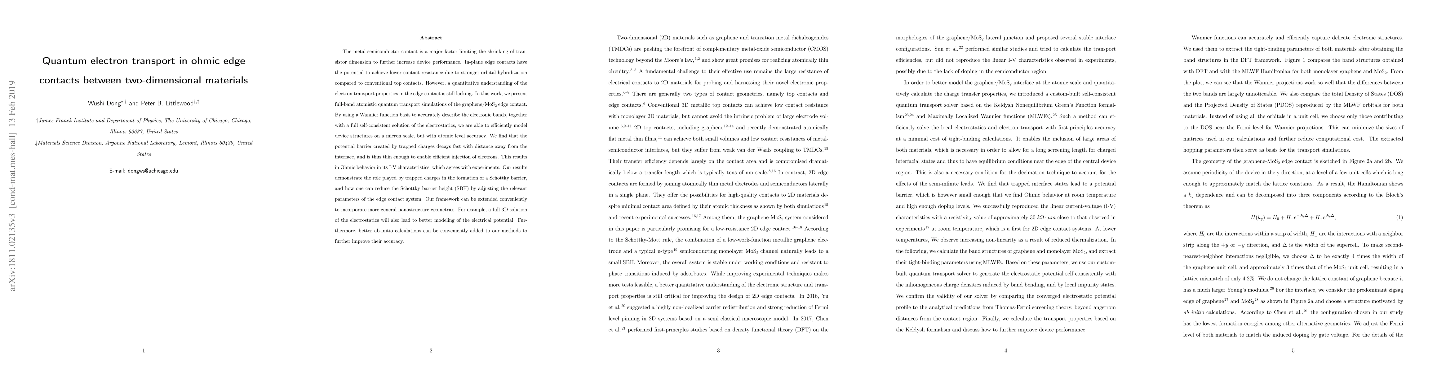 The metal-semiconductor contact is a major factor limiting the shrinking of transistor dimension to further increase device performance. In-plane edge contacts have the potential to achieve lower contact resistance due to stronger orbital hybridization compared to conventional top contacts. However, a quantitative understanding of the electron transport properties in the edge contact is still lacking. In this work, we present full-band atomistic quantum transport simulations of the graphene/MoS$_2$ edge contact. By using a Wannier function basis to accurately describe the electronic bands, together with a full self-consistent solution of the electrostatics, we are able to efficiently model device structures on a micron scale, but with atomic level accuracy. We find that the potential barrier created by trapped charges decays fast with distance away from the interface, and is thus thin enough to enable efficient injection of electrons. This results in Ohmic behavior in its I-V characteristics, which agrees with experiments. Our results demonstrate the role played by trapped charges in the formation of a Schottky barrier, and how one can reduce the Schottky barrier height (SBH) by adjusting the relevant parameters of the edge contact system. Our framework can be extended conveniently to incorporate more general nanostructure geometries. For example, a full 3D solution of the electrostatics will also lead to better modeling of the electrical potential. Furthermore, better ab-initio calculations can be conveniently added to our methods to further improve their accuracy.