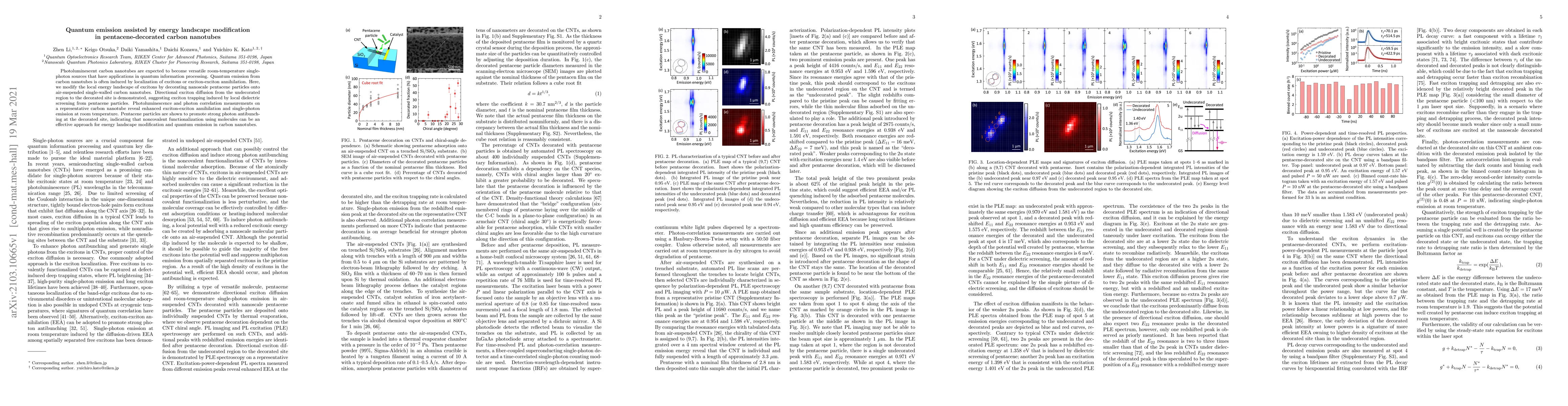 Photoluminescent carbon nanotubes are expected to become versatile room-temperature single-photon sources that have applications in quantum information processing. Quantum emission from carbon nanotubes is often induced by localization of excitons or exciton-exciton annihilation. Here, we modify the local energy landscape of excitons by decorating nanoscale pentacene particles onto air-suspended single-walled carbon nanotubes. Directional exciton diffusion from the undecorated region to the decorated site is demonstrated, suggesting exciton trapping induced by local dielectric screening from pentacene particles. Photoluminescence and photon correlation measurements on a representative carbon nanotube reveal enhanced exciton-exciton annihilation and single-photon emission at room temperature. Pentacene particles are shown to promote strong photon antibunching at the decorated site, indicating that noncovalent functionalization using molecules can be an effective approach for energy landscape modification and quantum emission in carbon nanotubes.