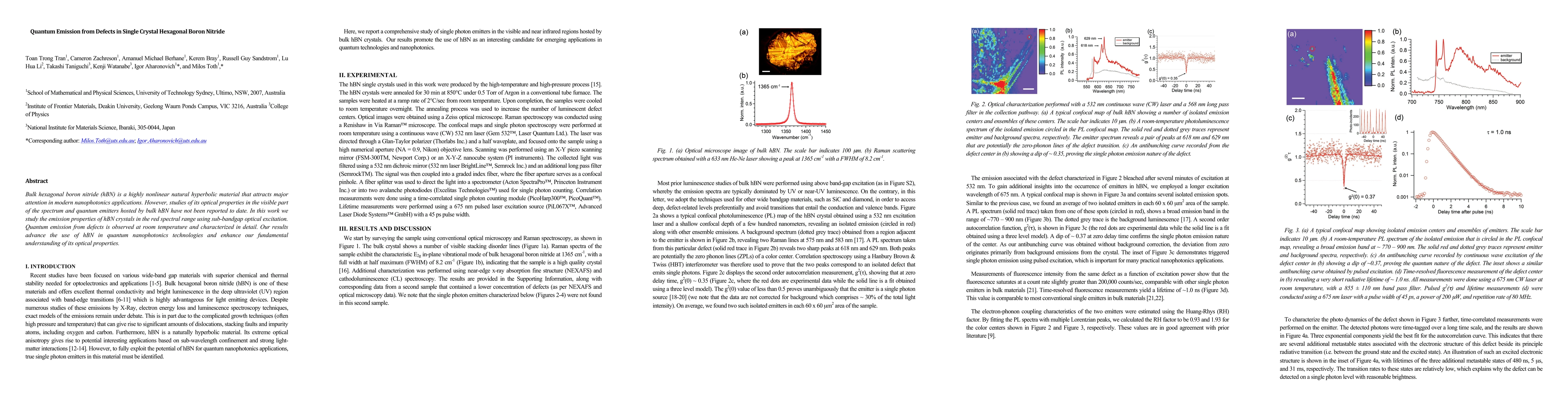 This study investigates the quantum emission from defects in bulk hexagonal boron nitride (hBN) crystals, revealing red spectral range emission at room temperature via sub-bandgap optical excitation. The findings enhance the potential for hBN in quantum nanophotonics and deepen the understanding of its optical properties.
