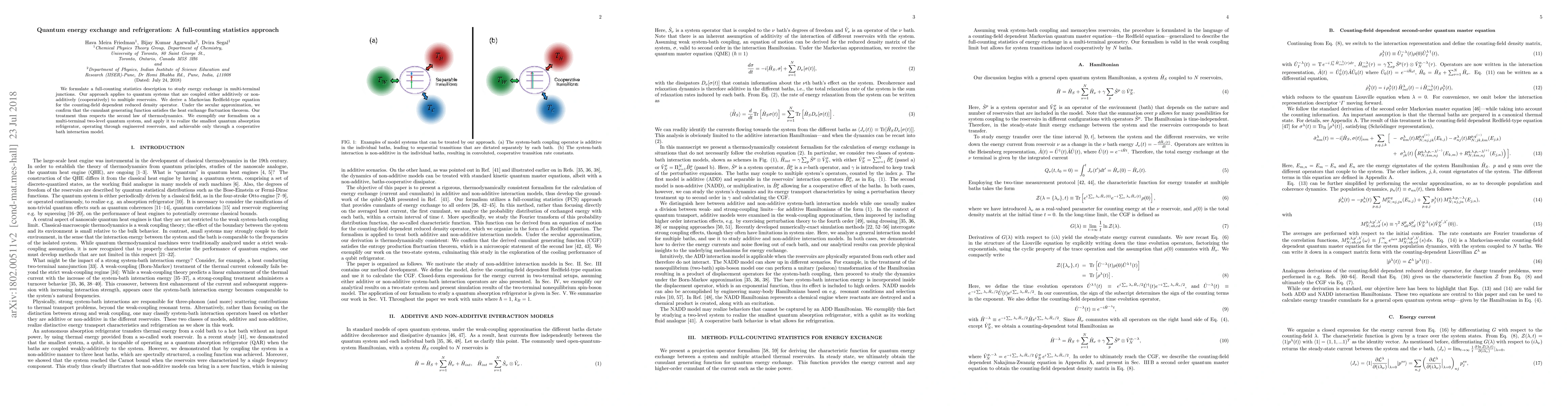 We formulate a full-counting statistics description to study energy exchange in multi-terminal junctions. Our approach applies to quantum systems that are coupled either additively or non-additively (cooperatively) to multiple reservoirs. We derive a Markovian Redfield-type equation for the counting-field dependent reduced density operator. Under the secular approximation, we confirm that the cumulant generating function satisfies the heat exchange fluctuation theorem. Our treatment thus respects the second law of thermodynamics. We exemplify our formalism on a multi-terminal two-level quantum system, and apply it to realize the smallest quantum absorption refrigerator, operating through engineered reservoirs, and achievable only through a cooperative bath interaction model.