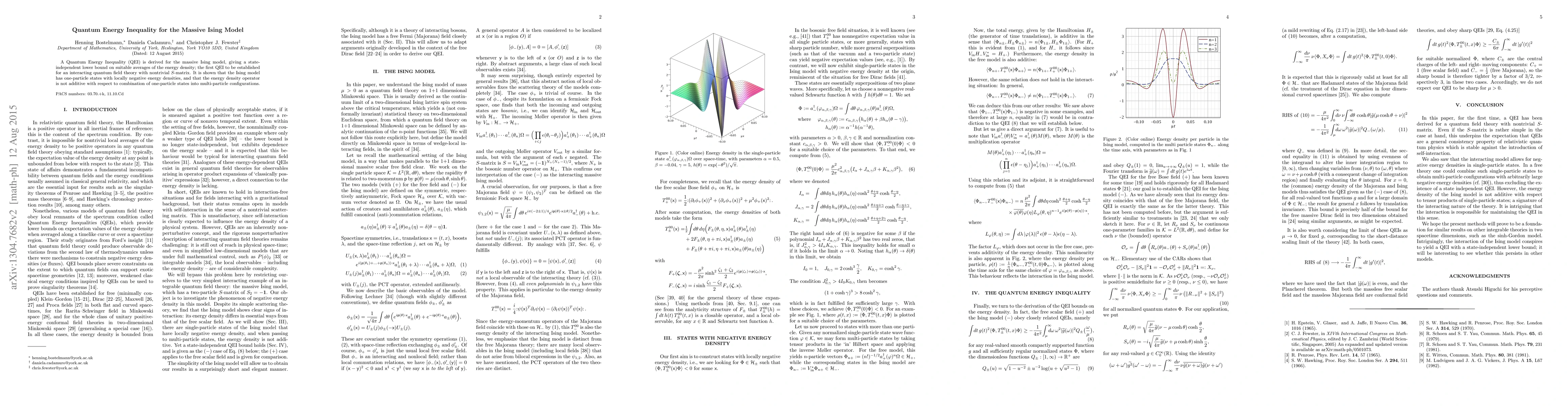 A Quantum Energy Inequality (QEI) is derived for the massive Ising model, giving a state-independent lower bound on suitable averages of the energy density; the first QEI to be established for an interacting quantum field theory with nontrivial S-matrix. It is shown that the Ising model has one-particle states with locally negative energy densities, and that the energy density operator is not additive with respect to combination of one-particle states into multi-particle configurations.