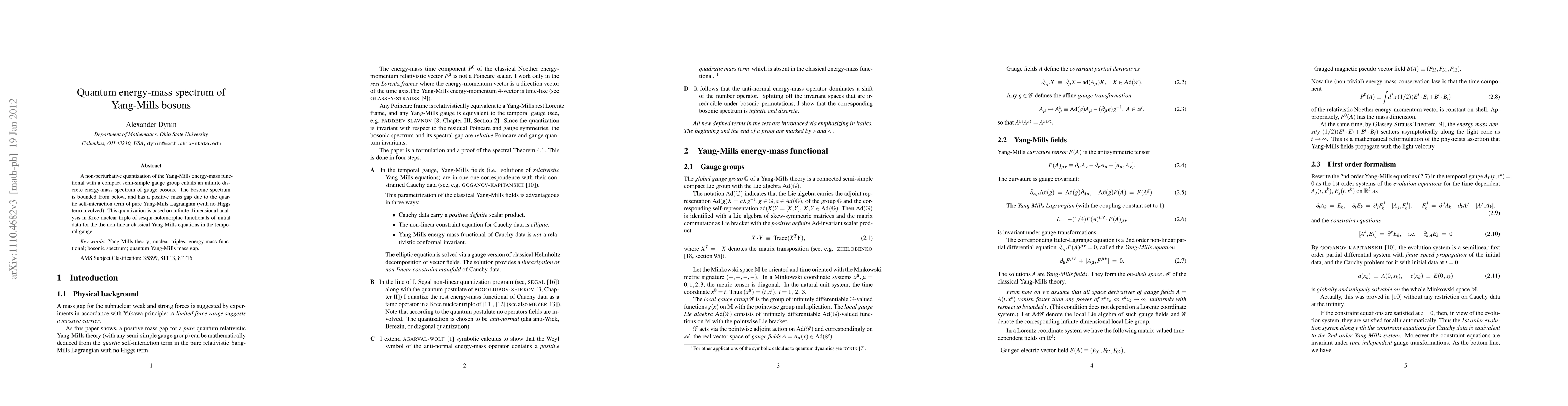 A non-perturbative quantization of the Yang-Mills energy-mass functional with a compact semi-simple gauge group entails an infinite discrete energy-mass spectrum of gauge bosons. The bosonic spectrum is bounded from below, and has a positive mass gap due to the quartic self-interaction term of pure Yang-Mills Lagrangian (with no Higgs term involved). This quantization is based on infinite-dimensional analysis in Kree nuclear triple of sesqui-holomorphic functionals of initial data for the the non-linear classical Yang-Mills equations in the temporal gauge.