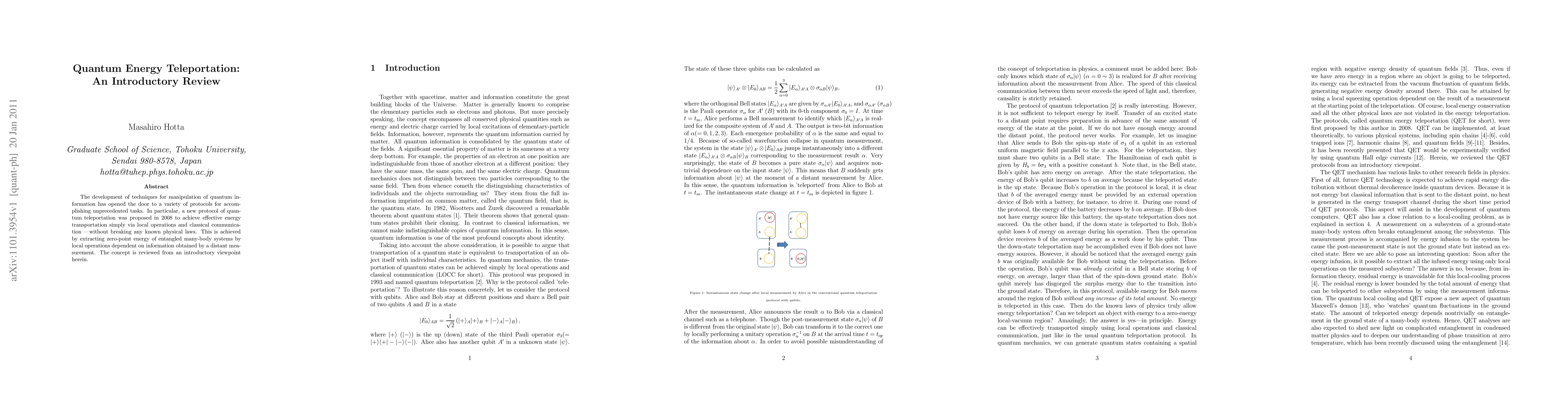 This paper reviews a 2008 protocol for quantum energy teleportation, which enables energy transportation via local operations and classical communication without violating physical laws, by leveraging the zero-point energy of entangled systems. The review provides an accessible introduction to the concept.
