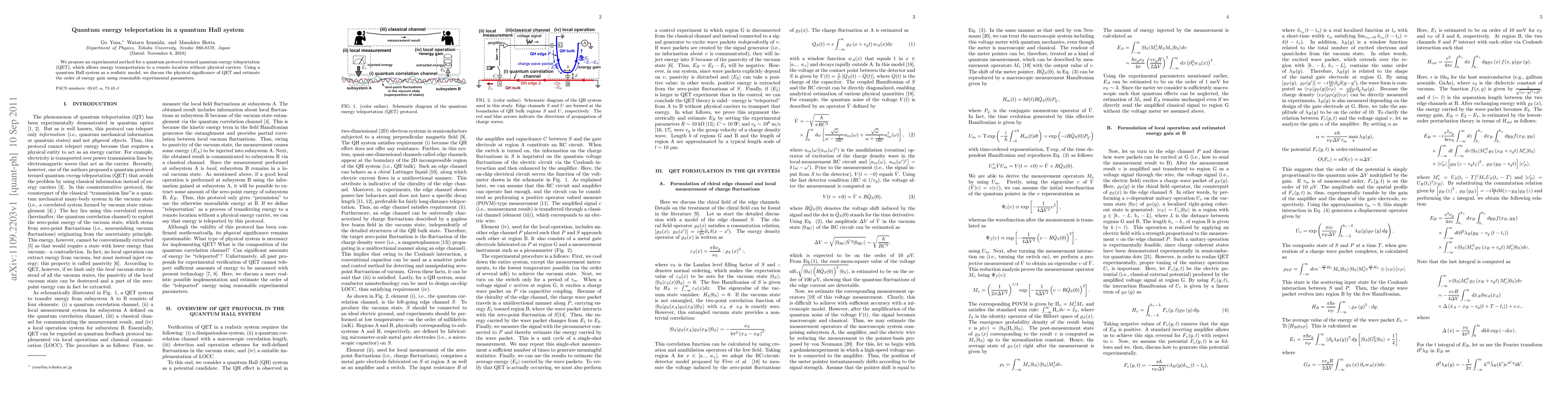 Summary: This paper proposes a quantum protocol called quantum energy teleportation (QET) for energy transfer without physical carriers, utilizing a quantum Hall system. It estimates the potential energy gain under realistic experimental conditions and discusses the physical implications of QET.