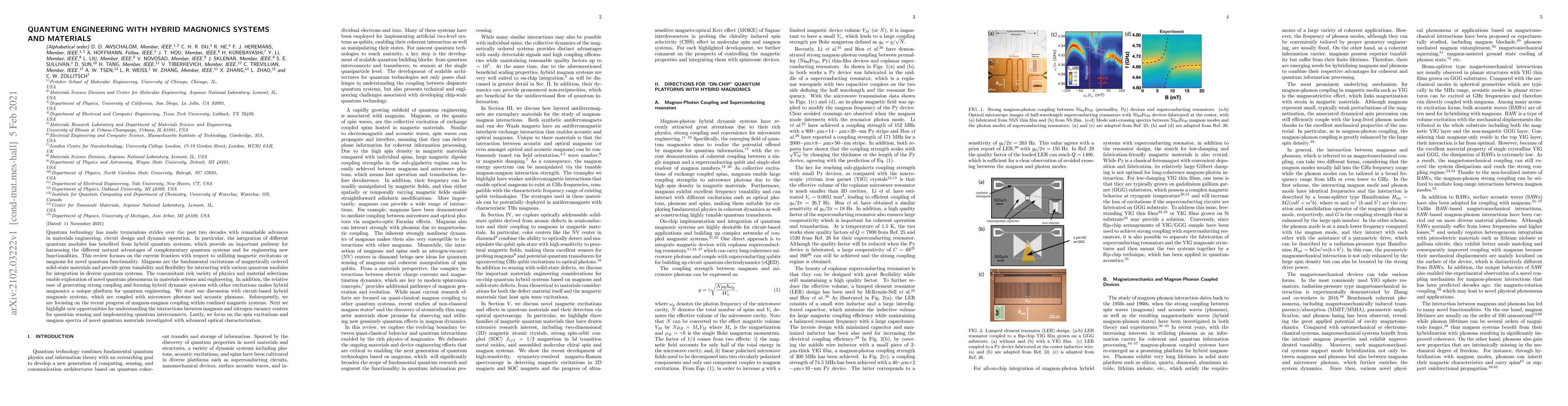 Quantum technology has made tremendous strides over the past two decades with remarkable advances in materials engineering, circuit design and dynamic operation. In particular, the integration of different quantum modules has benefited from hybrid quantum systems, which provide an important pathway for harnessing the different natural advantages of complementary quantum systems and for engineering new functionalities. This review focuses on the current frontiers with respect to utilizing magnetic excitatons or magnons for novel quantum functionality. Magnons are the fundamental excitations of magnetically ordered solid-state materials and provide great tunability and flexibility for interacting with various quantum modules for integration in diverse quantum systems. The concomitant rich variety of physics and material selections enable exploration of novel quantum phenomena in materials science and engineering. In addition, the relative ease of generating strong coupling and forming hybrid dynamic systems with other excitations makes hybrid magnonics a unique platform for quantum engineering. We start our discussion with circuit-based hybrid magnonic systems, which are coupled with microwave photons and acoustic phonons. Subsequently, we are focusing on the recent progress of magnon-magnon coupling within confined magnetic systems. Next we highlight new opportunities for understanding the interactions between magnons and nitrogen-vacancy centers for quantum sensing and implementing quantum interconnects. Lastly, we focus on the spin excitations and magnon spectra of novel quantum materials investigated with advanced optical characterization.