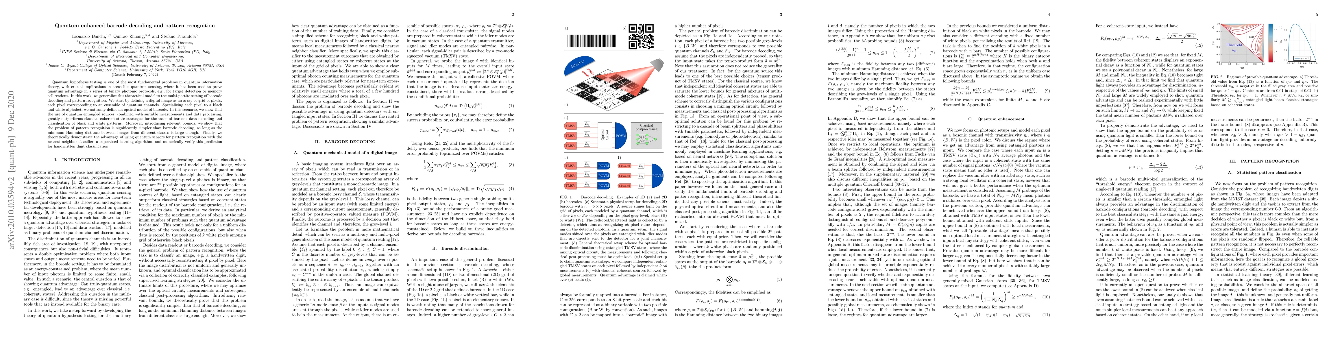 This paper explores quantum-enhanced methods for barcode decoding and pattern recognition, demonstrating that quantum entangled sources outperform classical strategies. It shows that quantum sensors significantly simplify pattern recognition when the minimum Hamming distance is large, and verifies this advantage through handwritten digit classification.