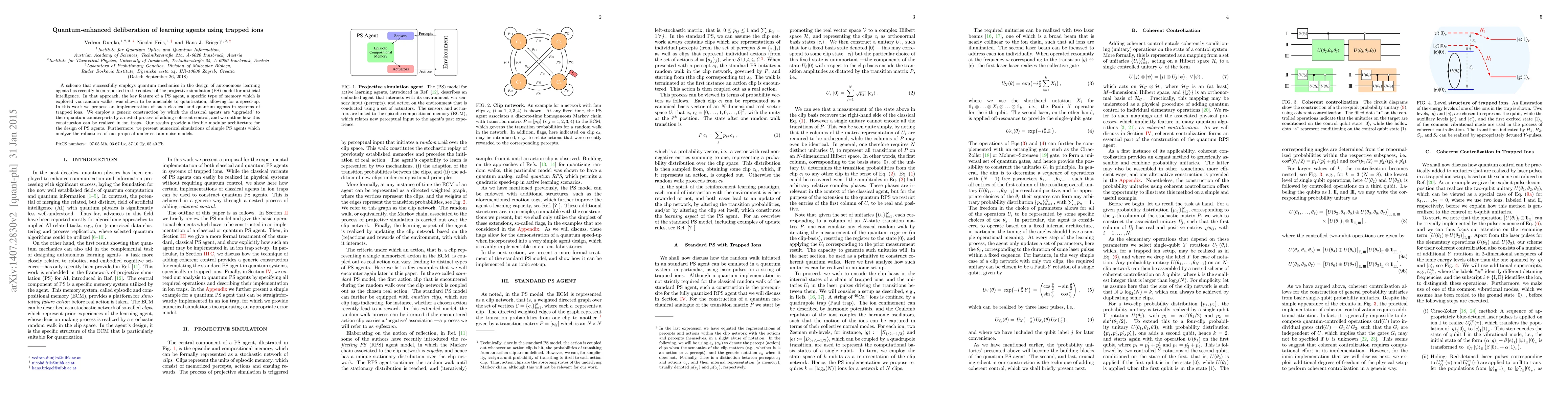 A scheme that successfully employs quantum mechanics in the design of autonomous learning agents has recently been reported in the context of the projective simulation (PS) model for artificial intelligence. In that approach, the key feature of a PS agent, a specific type of memory which is explored via random walks, was shown to be amenable to quantization. In particular, classical random walks were substituted by Szegedy-type quantum walks, allowing for a speed-up. In this work we propose how such classical and quantum agents can be implemented in systems of trapped ions. We employ a generic construction by which the classical agents are `upgraded' to their quantum counterparts by nested coherent controlization, and we outline how this construction can be realized in ion traps. Our results provide a flexible modular architecture for the design of PS agents. Furthermore, we present numerical simulations of simple PS agents which analyze the robustness of our proposal under certain noise models.